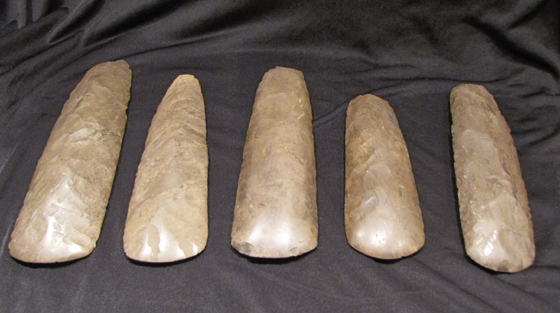 I love finding unique items like this. It is not a "Cache" but they did come out of one man's collection. There are thousands of collectors out there and not a handful has ever seen 5 Dover Adz like this in one frame. These are all from the Tennessee River area including Benton County Tennessee and adjoining counties. Renowned collector, Gary Noel, purchased these from the collector that put these together many years ago.