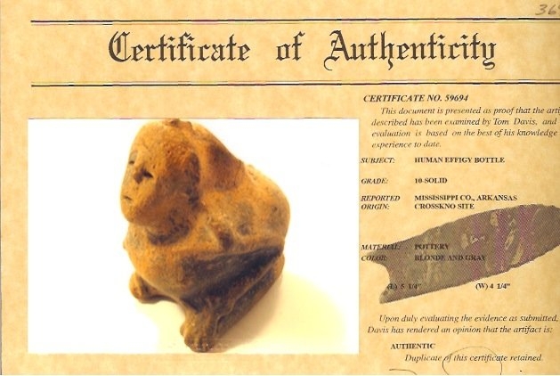 5 1/4” Full Body Human Effigy Bottle. Crosskno Site, AR. Solid. Classic Mask Face Design. Pictured on back cover of the Relic List (#75). Solid. Davis G10 COA.