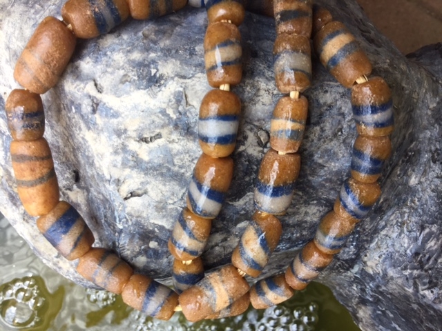 A 20" strand of blue, white, and brown, cylindrical, conjoined, trade beads. Magnification shows pitting, scratches and heavy use with nice patina. I have the shipping.