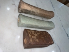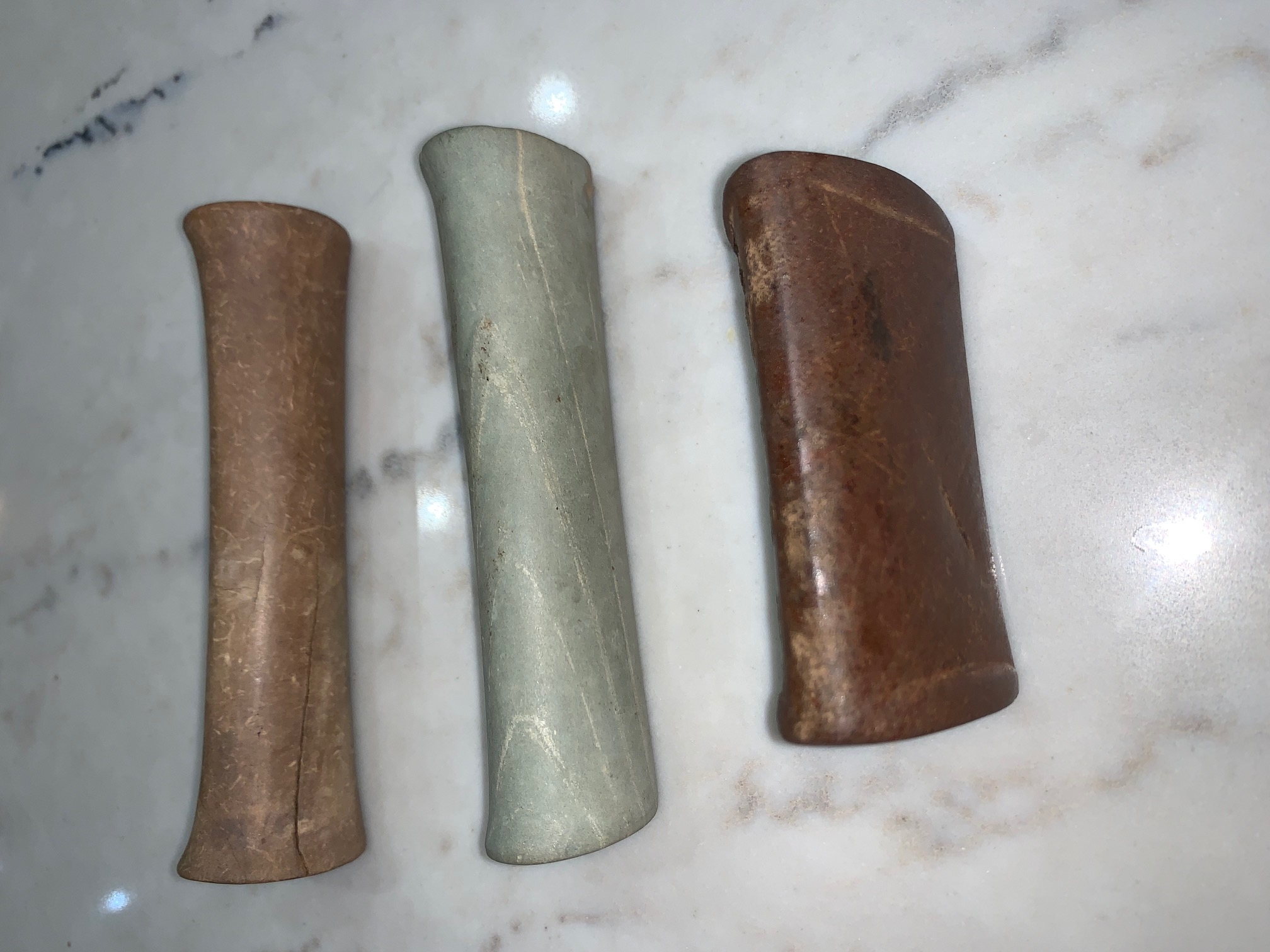 The Green one is a banded mint green Shale material found in Town Creek in Lee County Mississippi near Nettleton. Neal Brown always told me this type is referred to as a Spooled End Benton Tube - same as the brown one