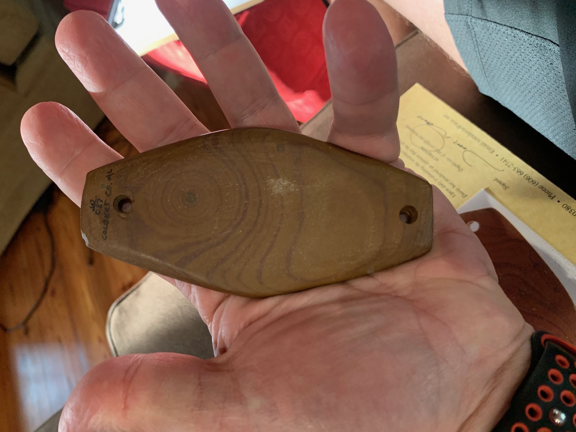 This is a very fine and rare form of Alabama Claystone. The Provenance on this relic makes it even more fine. It was found on Seven Mile Island by Tim Vaughn in 1987. Rick Weems purchased the gorget from Tim soon after he found it. Rick Weems sold it to Colonel John Berner in 2001 and John Berner sold it to Ray Kilgore sometime later - and then it found it's way to me as all good Southern Claystone Gorgets eventually do.