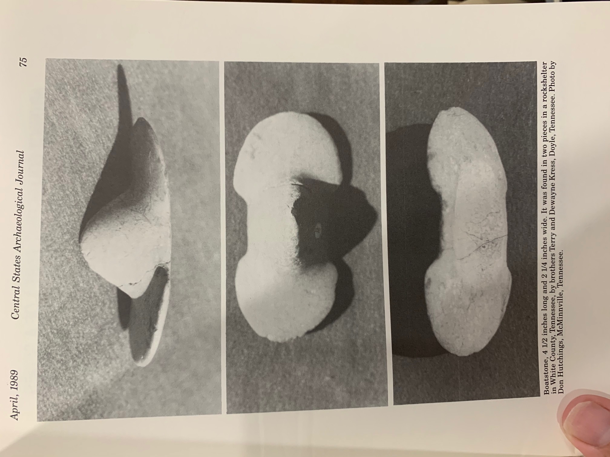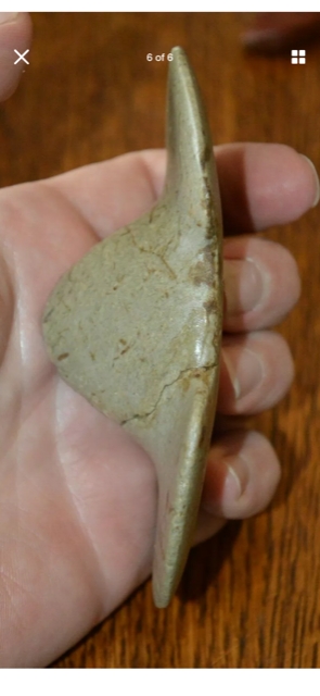 This outstanding Woodland Helmet style boatstone was found in Greene Co, Tennessee and measures 4.5/8 inches long and is 2.25 inches wide and is 1.5 inches tall at the center. This piece is made from a pale white colored fine grained Quartz material. This boatstone has amazing form and is one of the most stylized boatstones that I have ever seen. This piece was found broken in two and has been glued in the center but is still a great artifact. This piece was purchased from the collection of Tommy Beutell and is guaranteed to be 100% authentic and unaltered. Tommy paid $1,000.00 for this piece many years ago.