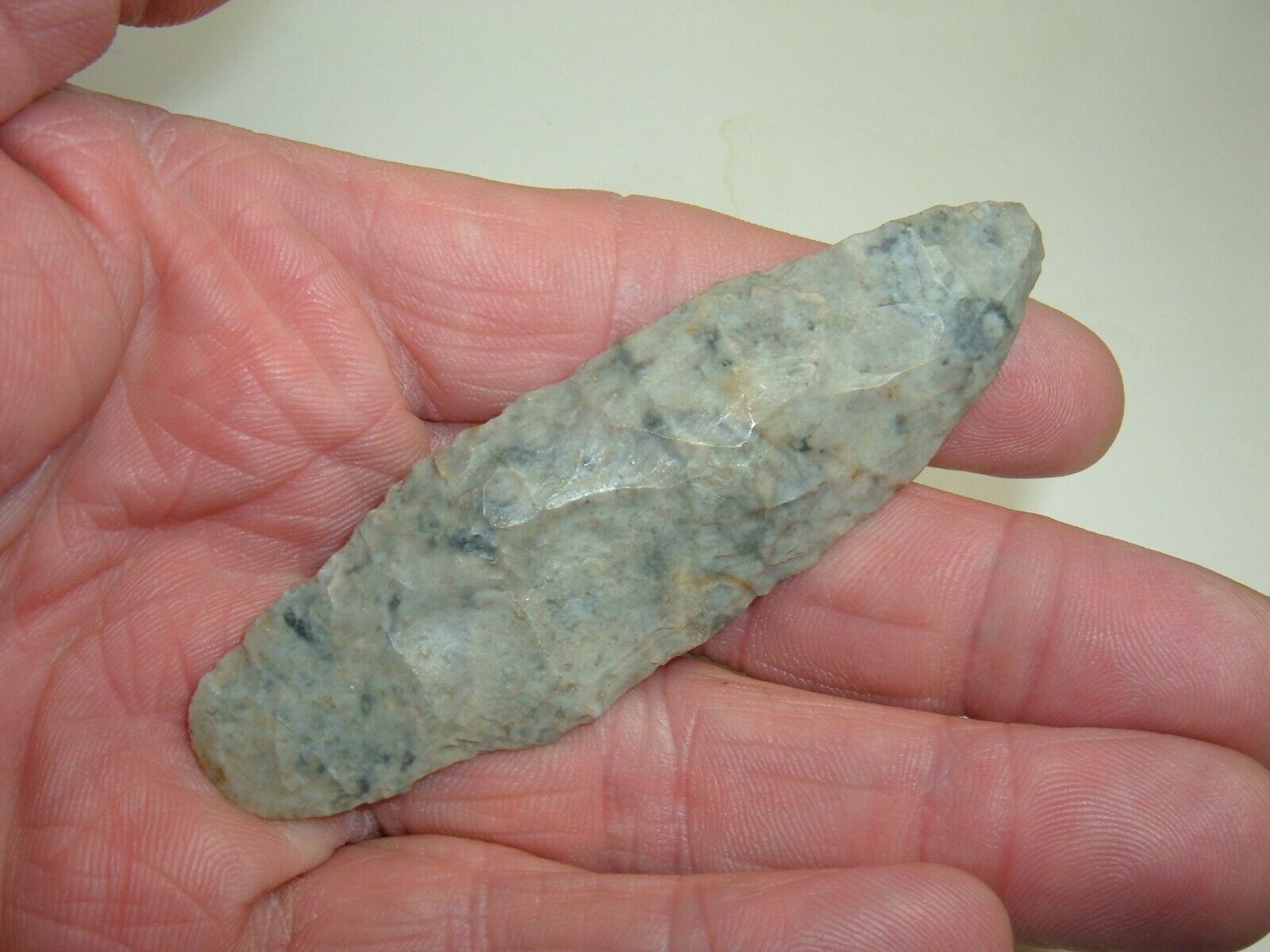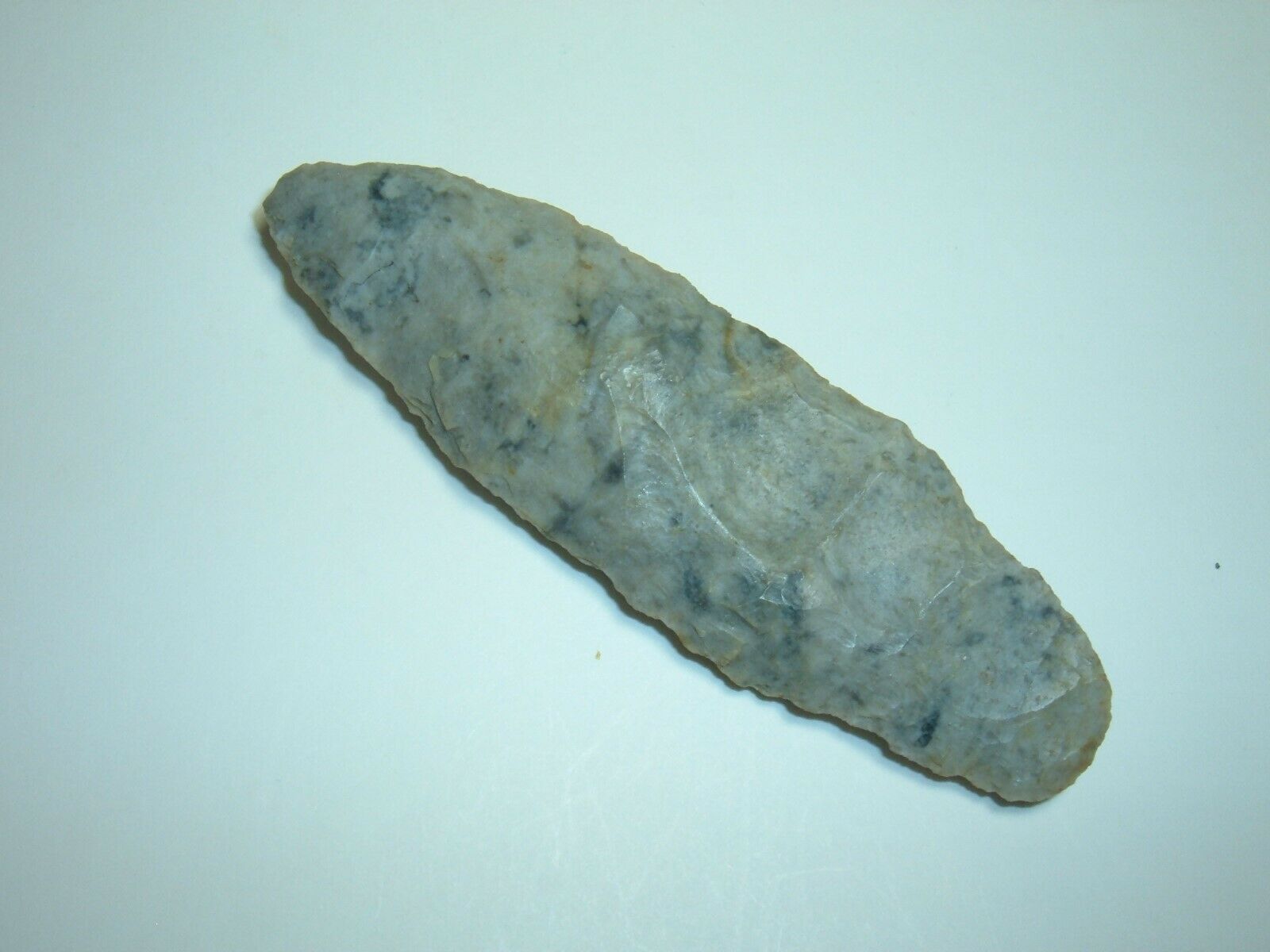 Offered from our collections is  a  EXCELLENT EARLYADENA  POINT FROM COSHOCTON  CO. OHIO NICE & LARGE  3 7/16"  EX. SIMON  THIS POINT CAME FROM  A BOB CONVERSE AUCTION AND IS SUPER WELL MADE & COLORFUL MATERIAL WHICH LOOKS MUCH LIKE FLINT RIDGE BUT I BELIEVE IT IS COLORFUL,HIGH GRADE COSHOCTON, GRAYISH CREAM WITH BLUE SPECKS , A NICE LOOKING POINT!!!!(SEE PICTURES),VERY PLEASING TO THE EYE WELL FLAKED & JUST A NICE EXAMPLE OF EARLY   ADENA WORKMANSHIP! A VERY NICE RELIC INDEED ! YOU WILL NOT BE DISAPPOINTED!
