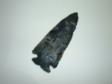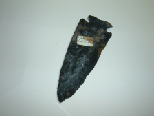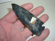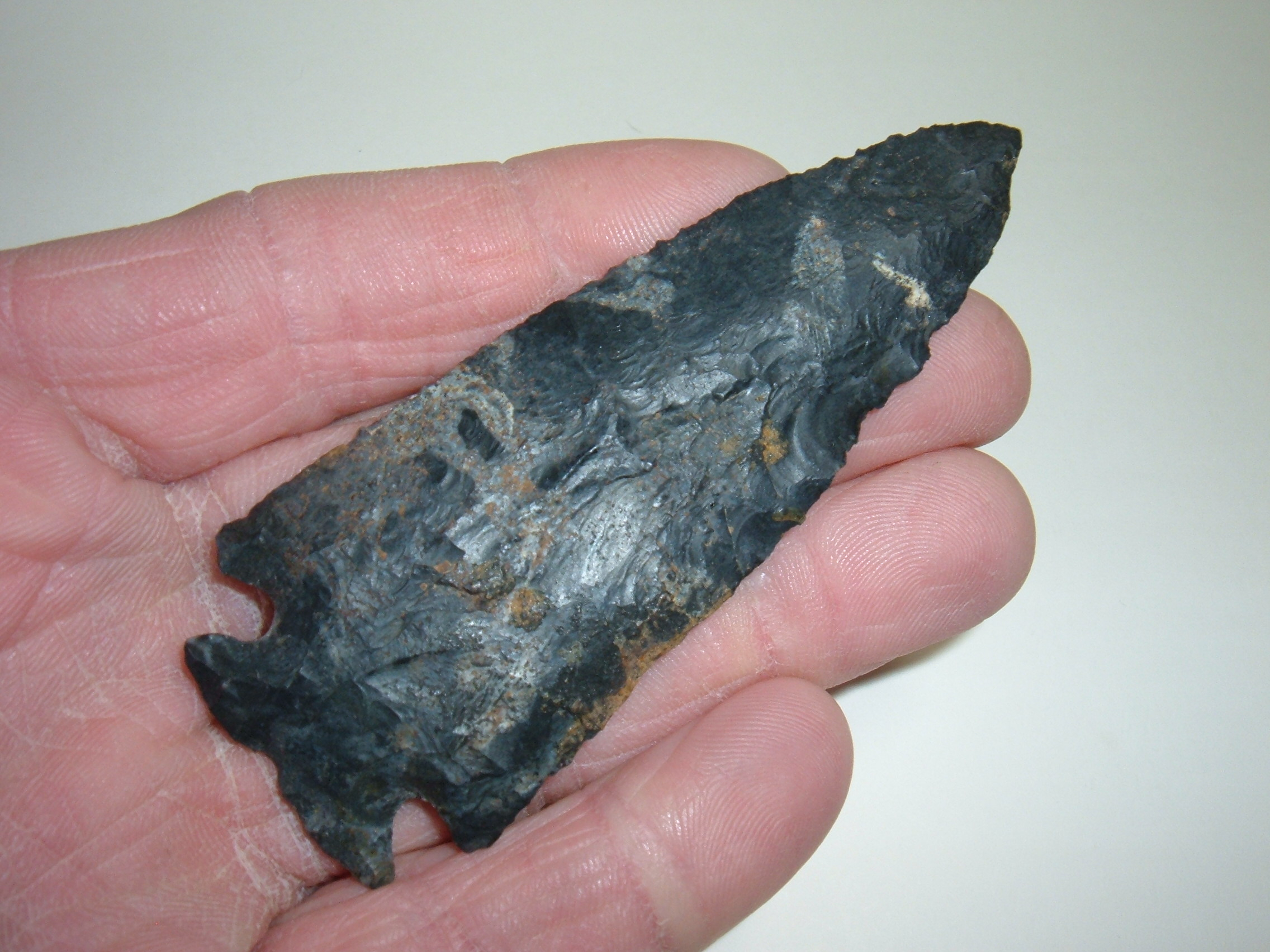 RIGHT OUT OF OUR OWN COLLECTING FRAMES THIS FINE NOTCH BASE DOVETAIL, 3 5/8" FROM FRANKLIN CO.OHIO MADE FROM HIGHLY REGARDED BLACK COSHOCTON FLINT AND IS EX DAVE ELLIS. A TRULY KILLER NOTCH BASE DOVE WELL FLAKED AND THIN,A REAL BEAUTY!