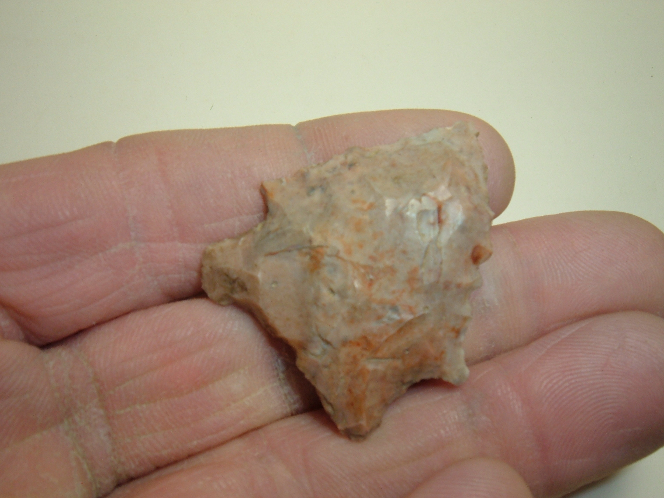 HERE WE HAVE ANOTHER FINE POINT FROM OUR OWN PERSONAL COLLECTIONS,THIS COLORFUL,OUTSTANDING KIRK CORNER NOTCH, 1 5/8" FROM PERRY CO. OHIO AND MADE FROM HIGHLY SOUGHT COLORFUL ,ORANGE FLINT RIDGE FLINT ! THIS RELIC IS EX BRYAN DONALDSON. OUTSTANDING LIGHT ORANGE COLOR WITH SOME DARKER ORANGE MOTTLING MIXED IN, KILLER POINT FOR THAT ARCHAIC COLLECTION!