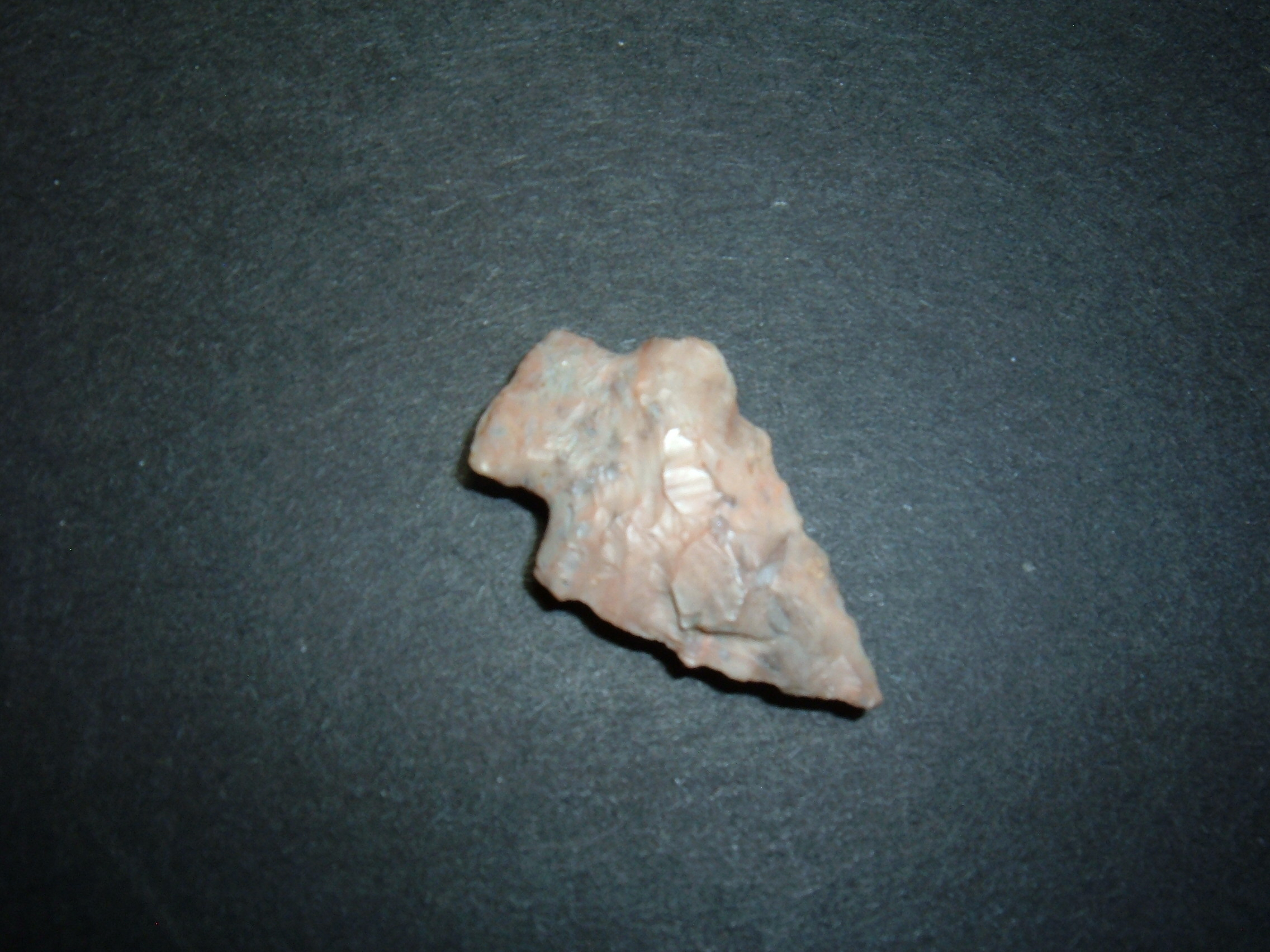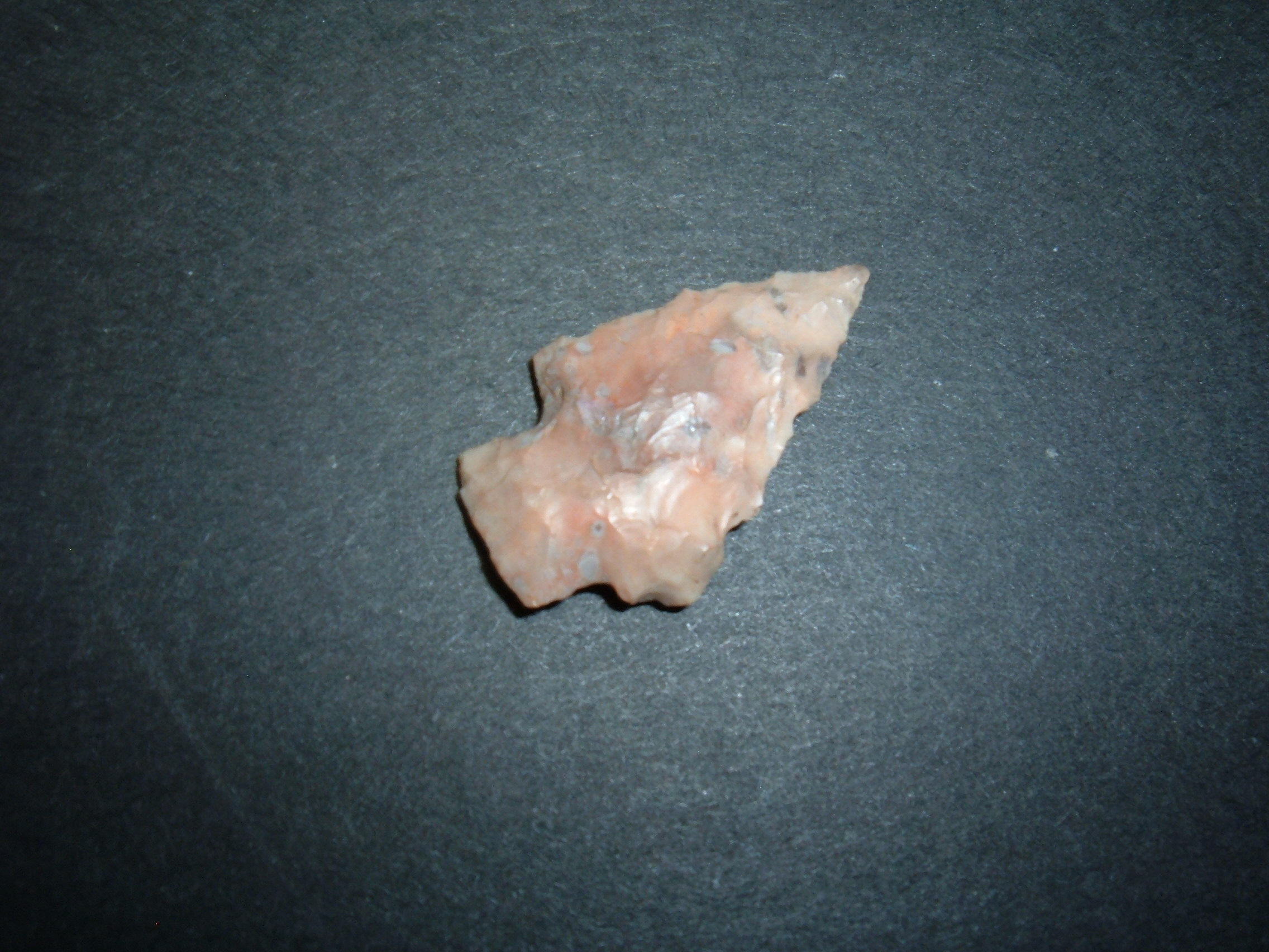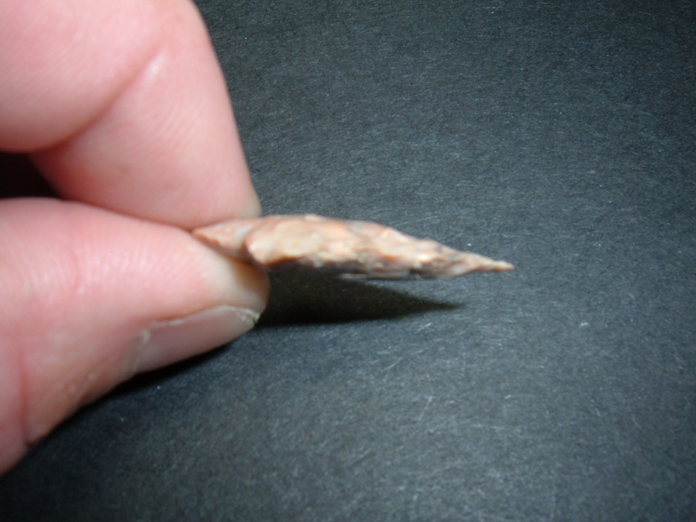 HERE'S A VERY UNUSUAL EXAMPLE OF A BIRD POINT,1 1/8" FOUND IN MUSKINGUM CO.OHIO AND MADE FROM BEAUTIFUL HIGHLY COLLECTABLE EXOTIC FLINT RIDGE FLINT WITH SUBTLE ROSE COLORATION ON BOTH SIDES OF THE POINT!VERY UNUSUAL SHAPE THIS FINE RELIC WAS APPARENTLY MADE THIS WAY BY IT'S ANCIENT CRAFTSMAN! EXHIBITS BEAUTIFUL FLAKING!!!