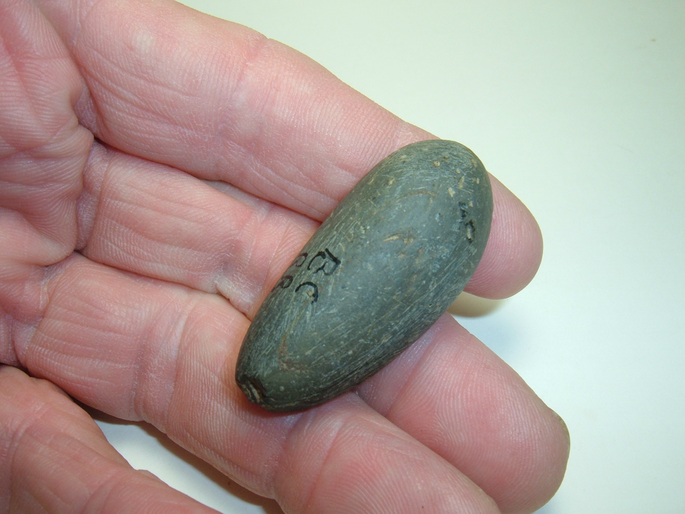 FROM OUR PERSONAL COLLECTIONS COMES THIS VERY FINE SLATE PLUMMET,1 5/8" FOUND IN KNOX CO.OHIO AT RAILROAD SIRE 13 BY BOB CHAMPION A MAN WHO LOGGED SOME SERIOUS HOURS OF RELIC COLLECTIONS IN THE FIELD! BEAUTIFUL BANDED SLATE FROM A WELL KNOWN OHIO COLLECTOR!