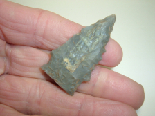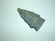 HERE IS A REALLY NICE SERRATED ARCHAIC FROM LICKING CO.OHIO 1 3/4" AND IS MADE FROM FINE INDIANA HORNSTONE! VERY GOOD SERRATIONS HAS SICKER GLUE ON FROM A PREVIOUS COLLECTION THAT WOULD EASILY BE REMOVED!