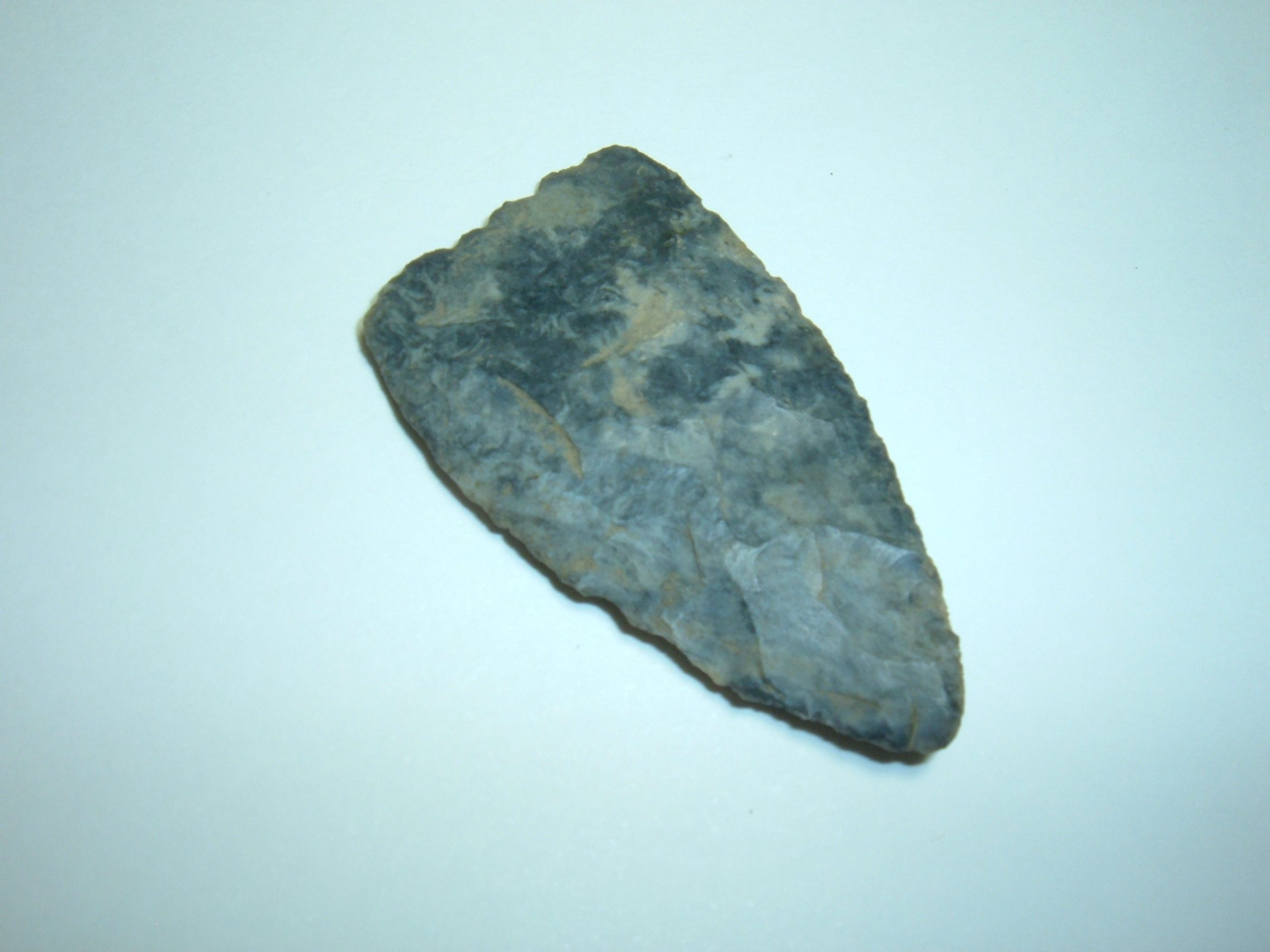 ***** SORRY-SPIRIT,THE HAM MADE HIS WAY INTO 2 OF THE PICTURES BUT YOU WILL SEE THE POINT TOO! SORRY!!!!*****THIS FINE FORT ANCIENT TRIANGLE IS QUITE LARGE AND UNUSUALLY THIN AND ONE OF THE BETTER YOU WILL SEE! 1 7/8", MADE FROM BEAUTIFUL MOTTLED COSHOCTON/UPPER MERCER FLINT AND FOUND IN THE EARLY 1900'S BY WIL;LIAM T.DILLWOTH AND FATHER JAY ON ASHLAND/MEDINA CO.OHIO BORDERS! INCREDIBLY THIN AND FLAKED FOR THE FORT ANCIENT TRIANGLE TYPE. STUNNING!