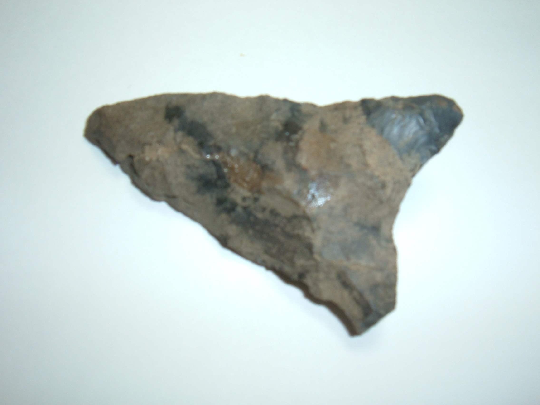 THIS IS ONE BIG LEVANNA TRIANGLE , 2 3/8" AND FOUND IN OTSEGO CO, NEW YORK! MATERIAL IS ONANDAGA CHERT AND QUITE IMPRESSIVE! IT HAS A TINY BIT OF ANCIENT DAMAGE TO THE ONE EAR OTHERWISE A VERY LARGE, NICE POINT!