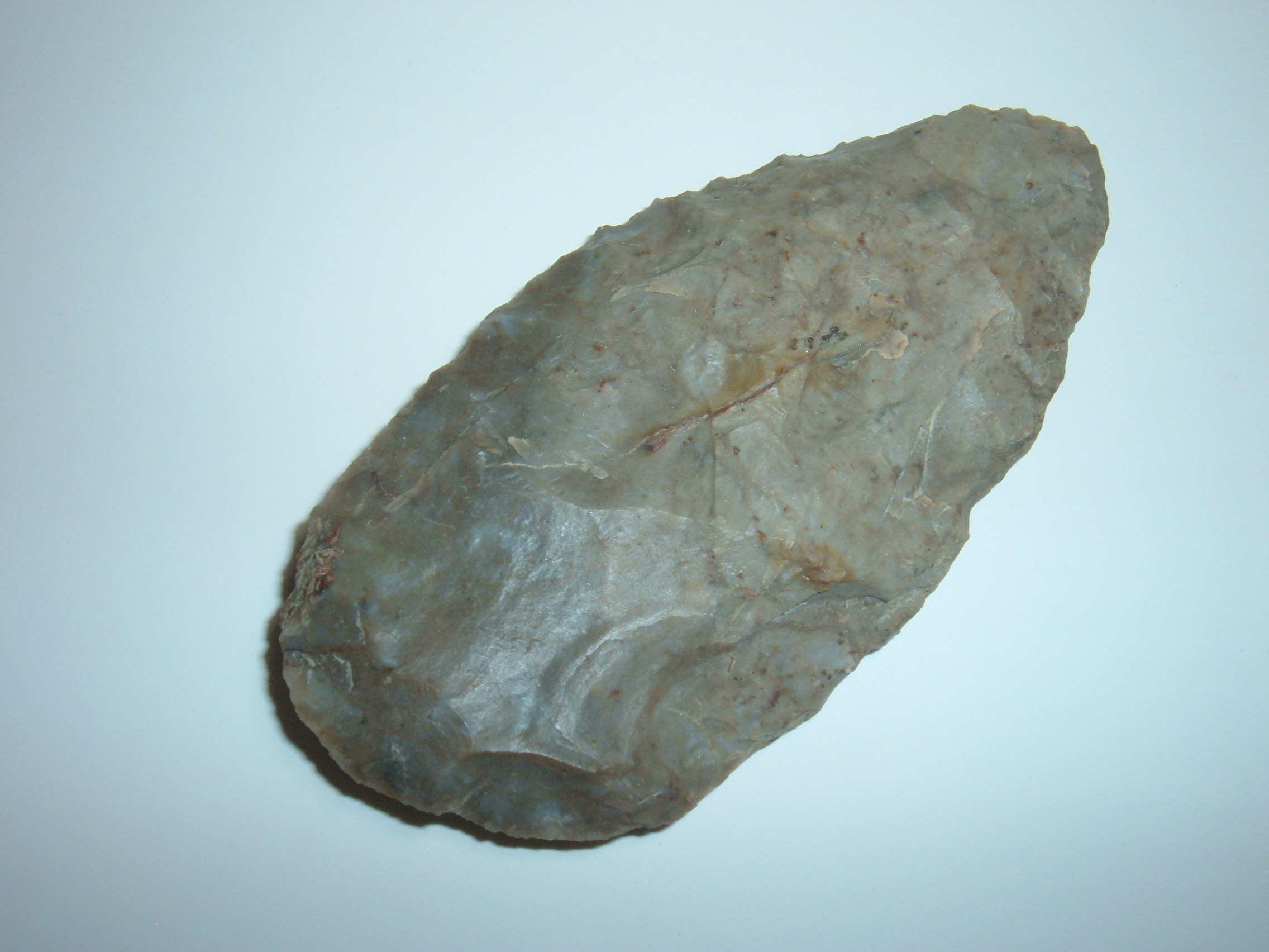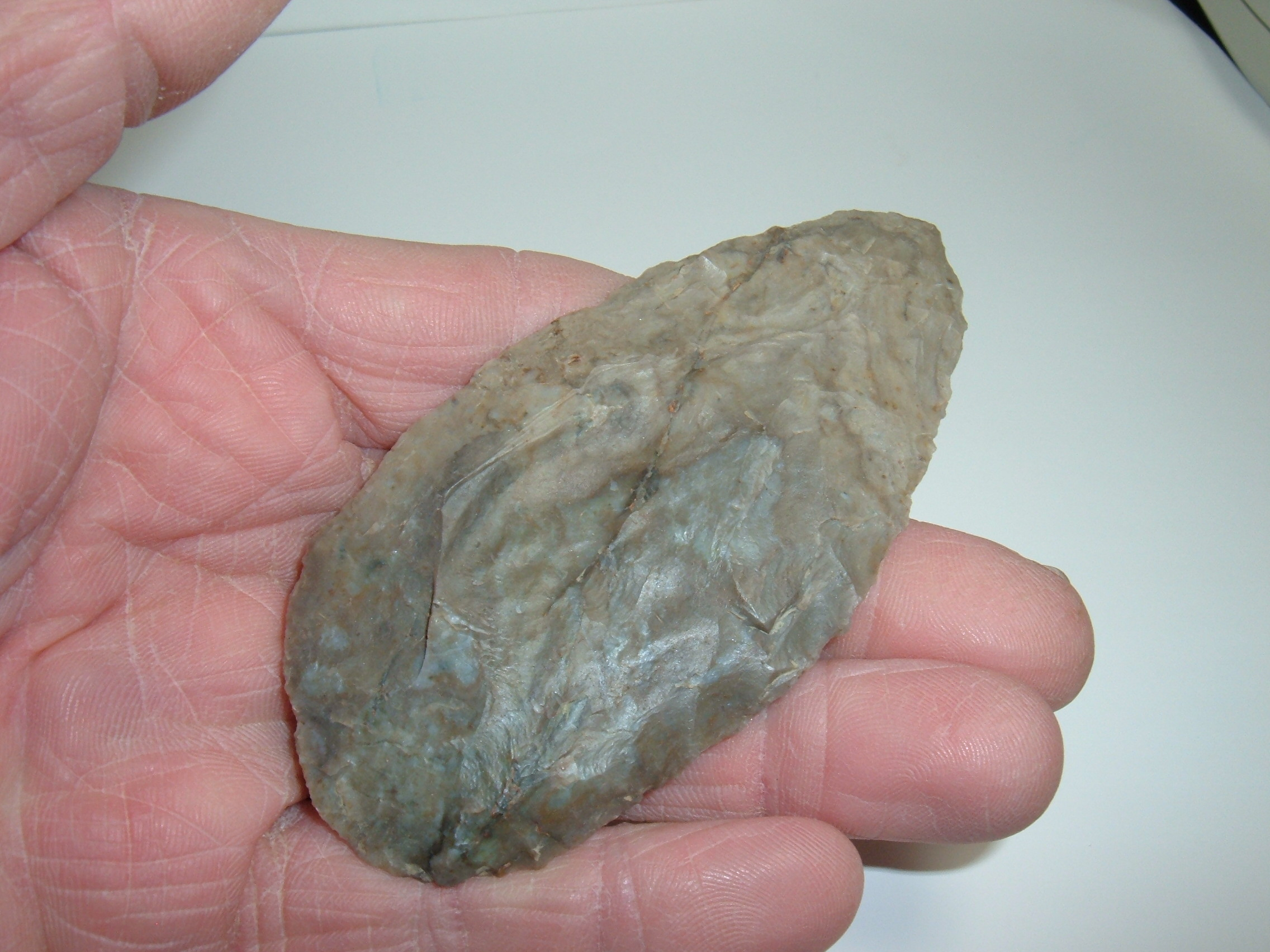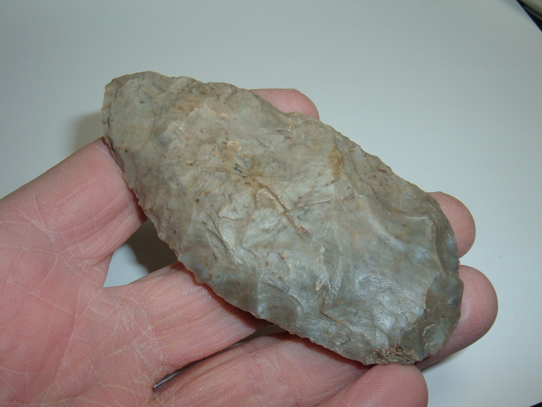 HERE IS A VERY NICE SIZE ADENA CACHE BLADE, 3 3/4" AND FOUND ON THE ASHLAND/MEDINA CO.OHIO BORDER BY WILLIAM T.DILLWORTH SR. AND HIS FATHER JAY IN THE EARLY 1900'S! MATERIAL IS FINE COSHOCTON GRAY FLINT,SUPER EXAMPLE OF THE TYPE AND NICE AND LARGE!!!