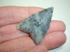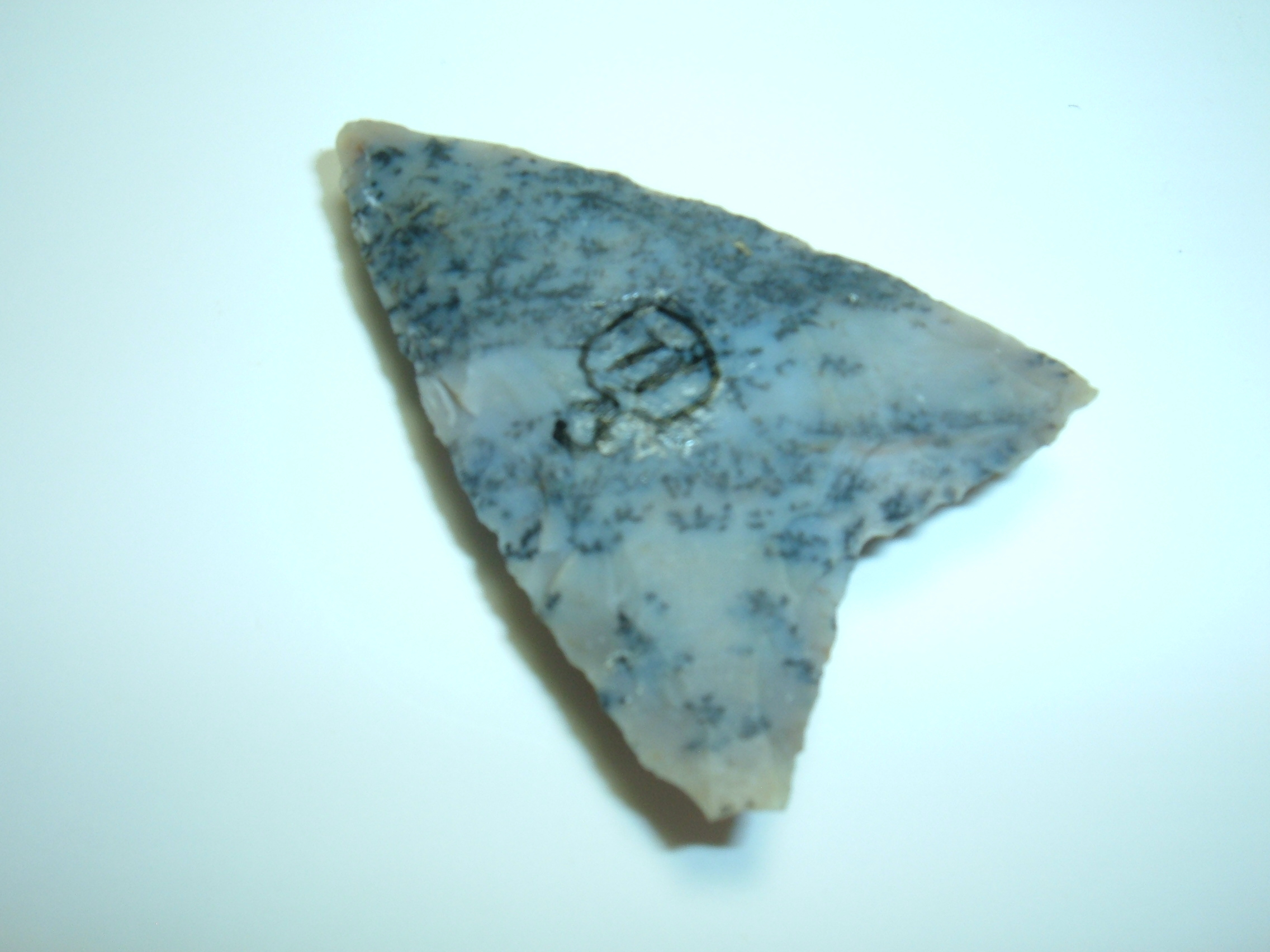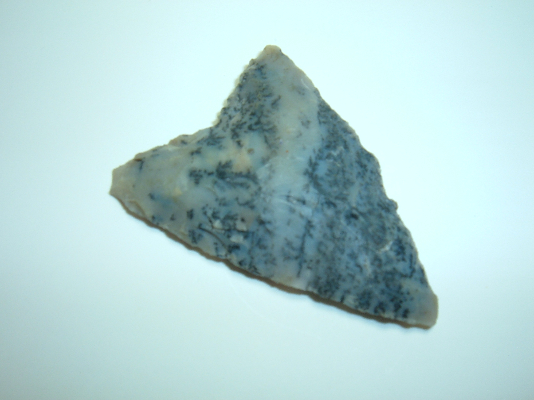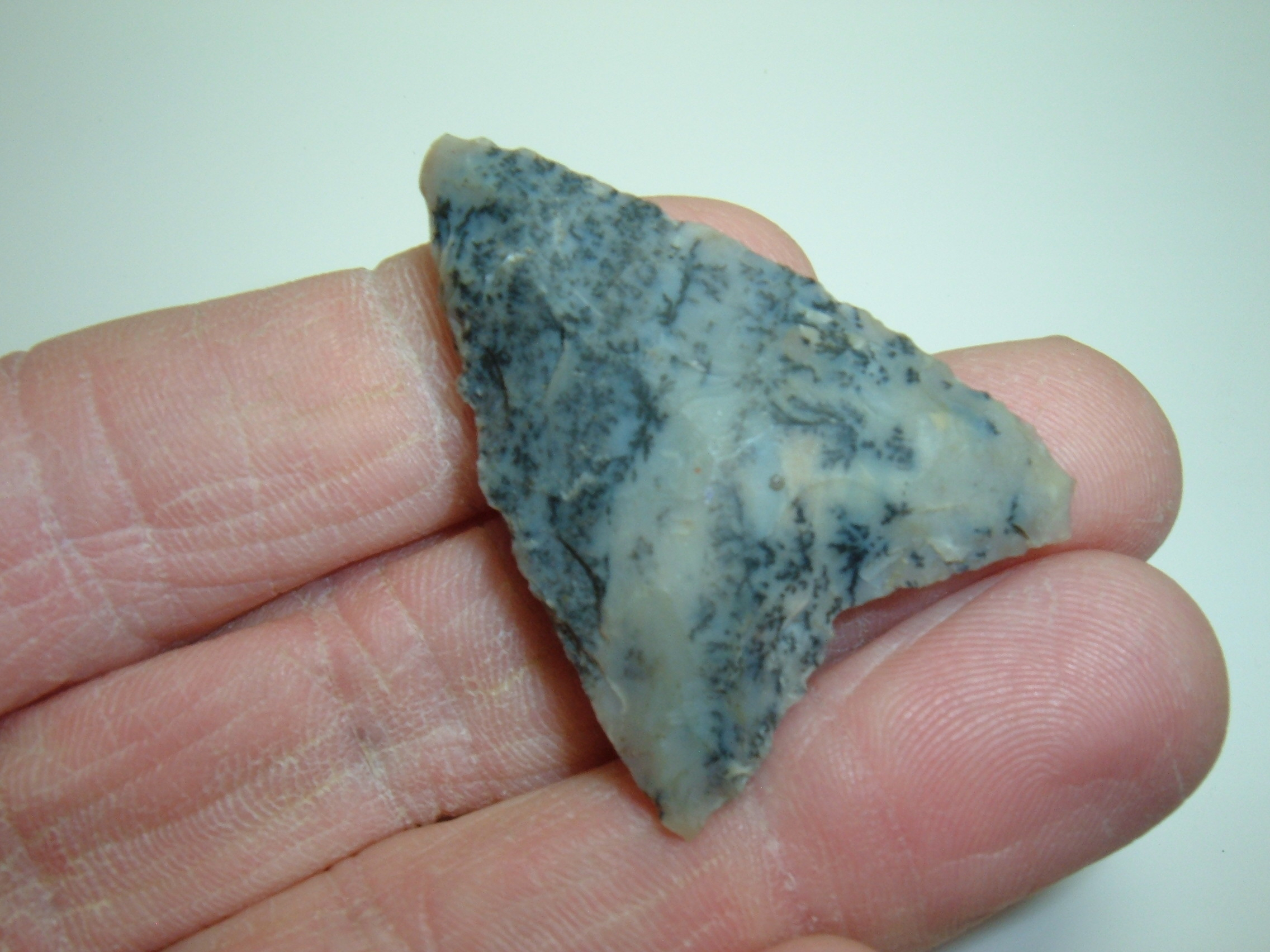 YOU WILL NOT FIND ANY FORT ANCIENT TRIANGLES BETTER THAN THIS EXAMPLE! FOUND IN FRANKLIN CO.OHIO 1 3/4" THIS IS THE SCARCE "COLES TYPE" BUT MORE IMPORTANTLY IS IS MADE OUT OF ALMOST UNOBTAINABLE EXOTIC BLUR GRAY FLINT RIDGE FLINT!!! FLINT RIDGE IS ALMOST UNHEARD OF IN THER FORY ANCIENT TYPE (CEE BOB CONVERSE'S" OHIO FLINT TYPES" PAGES 150 & 151 ! ADD TO THIS THE FACT THAT IT CAME OUT OF THE FAMOUS COLLECTION OF DR,STANLEY COPELAND,EXTREMELY WELL KNOWN AMONG OHIO COLLECTORS AND YOU HAVE A RARE ,DYNAMITE COMBNINATION! LASTLY IT IS IMPECCABLY MADE AND VERY HIGH GRADE! i'M GOING TO SAY THE "BEST OF THE BEST"!!!