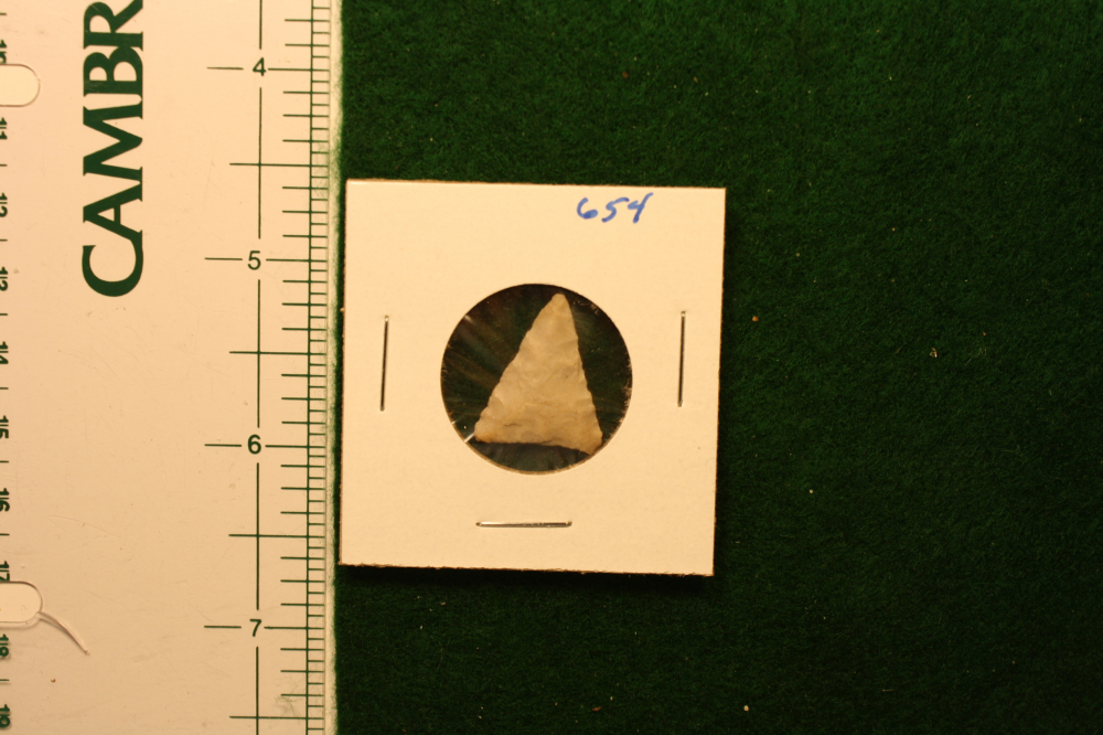 This is a finely made triangle arrowhead that has no apparent flaws. This point was put in a coin folder for protection.