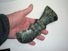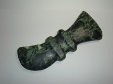 MEASUREING IN AT 7 1/4" THIS MEUSEUM PIECE IS MADE OF THE MOST BEAUTIFUL GREEN,BLACK AND WHITE CHLORITE IMAGINEABLE.THIS RELIC WAS NEVER DRILLED AND WAS SALVAGED BY ARCHAIC MAN MAKING THIS OBJECT OF ANCIENT ART EVEN MORE INTRINSICALLY BEAUTIFUL!