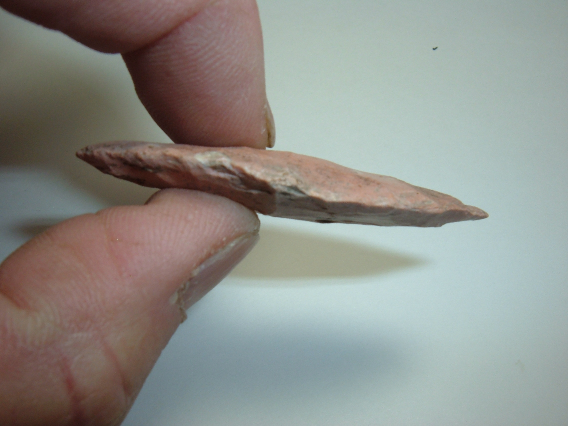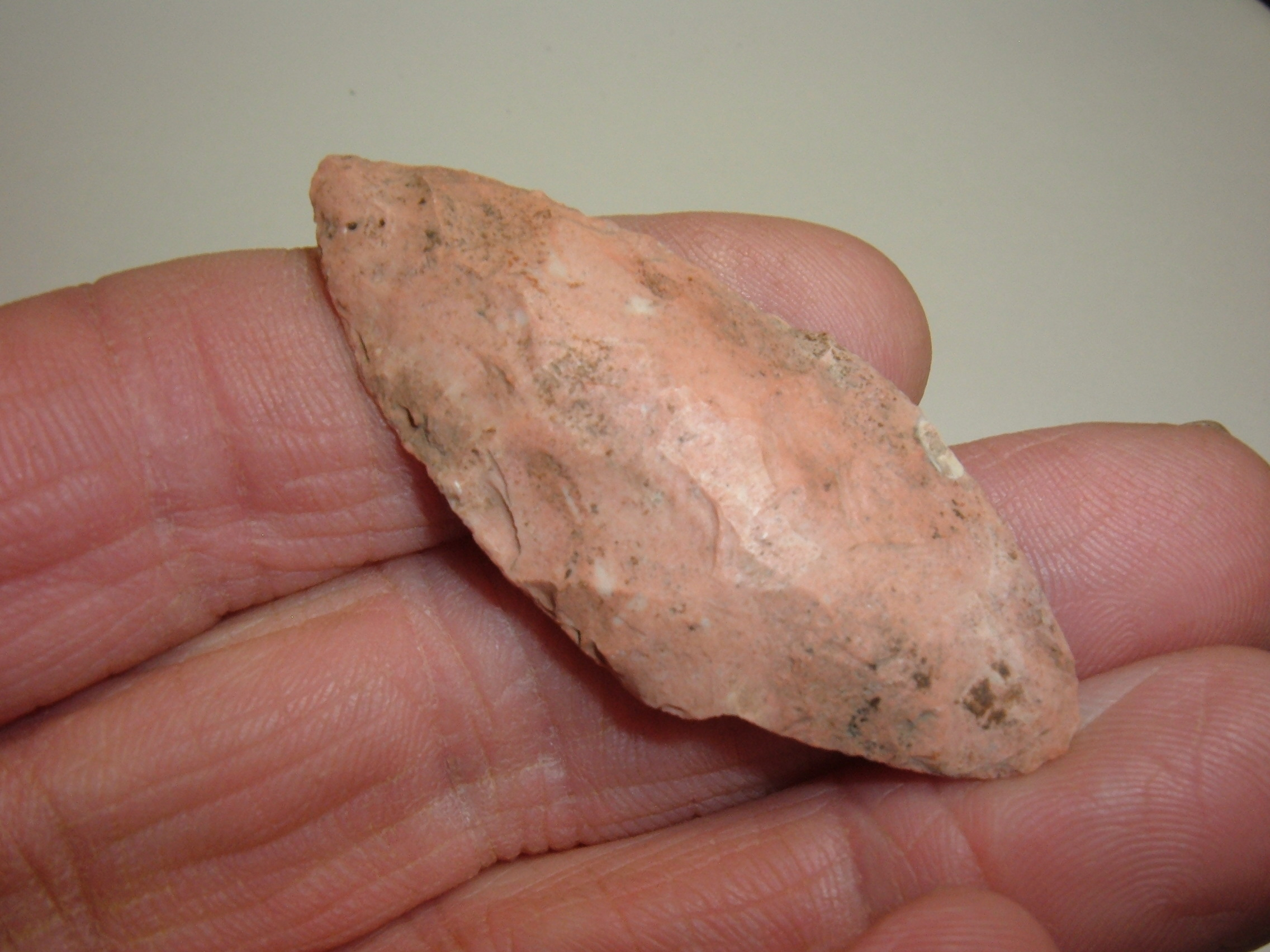 HERE WE HAVE A WONDERFUL EARLY ADENA BEAVERTAIL , 2 3/16" FOUND IN ALLEN CO. OHIO AND HAVING A BEAUTIFUL ORANGE COLORED FLINT TO IT, MAY WELL BE FLINT RIDGE OR POSSIBLY A HEAT TREATED CHERT, WHATEVER MATERIAL IT IS A VERY APPEALING RELIC!!!