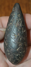 This very well made and highly stylized California Charmstone was found in Kings Co, California and measures 4.7/8 inches long and is 1.5/8 inches wide across the body of the piece. This piece is very well made and is made from a quality tan and red siltstone or similar material. This piece was formerly in the collection of George Heckman from Ohio and Ex Mitch Lewis