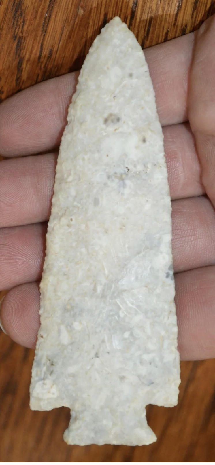Rare Archaic Short based Hardin found in Adams Co, Illinois and measures 4.3/8 inches long and is 1.5 inches wide across the shoulders of the point. This point is made from a great piece of white and blue Crescent Quarry Chert and is really a great piece. This point is from the Tom Browner Collection. It is a very well made piece with great form and excellent workmanship. Ex Mitch Lewis