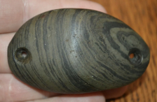Very Rare Beautiful banded slate Woodland cupped and drilled boatstone found in Hancock Co, Ohio and measures 2.7/8 inches long and is 1.5/8 inches wide and is 1 inch tall at the center of the piece. This piece is made from a great piece of banded slate. This boatstone was formerly in the collection of William Tiell and Jim MIller both from Northern Ohio. Ex Mitch Lewis.