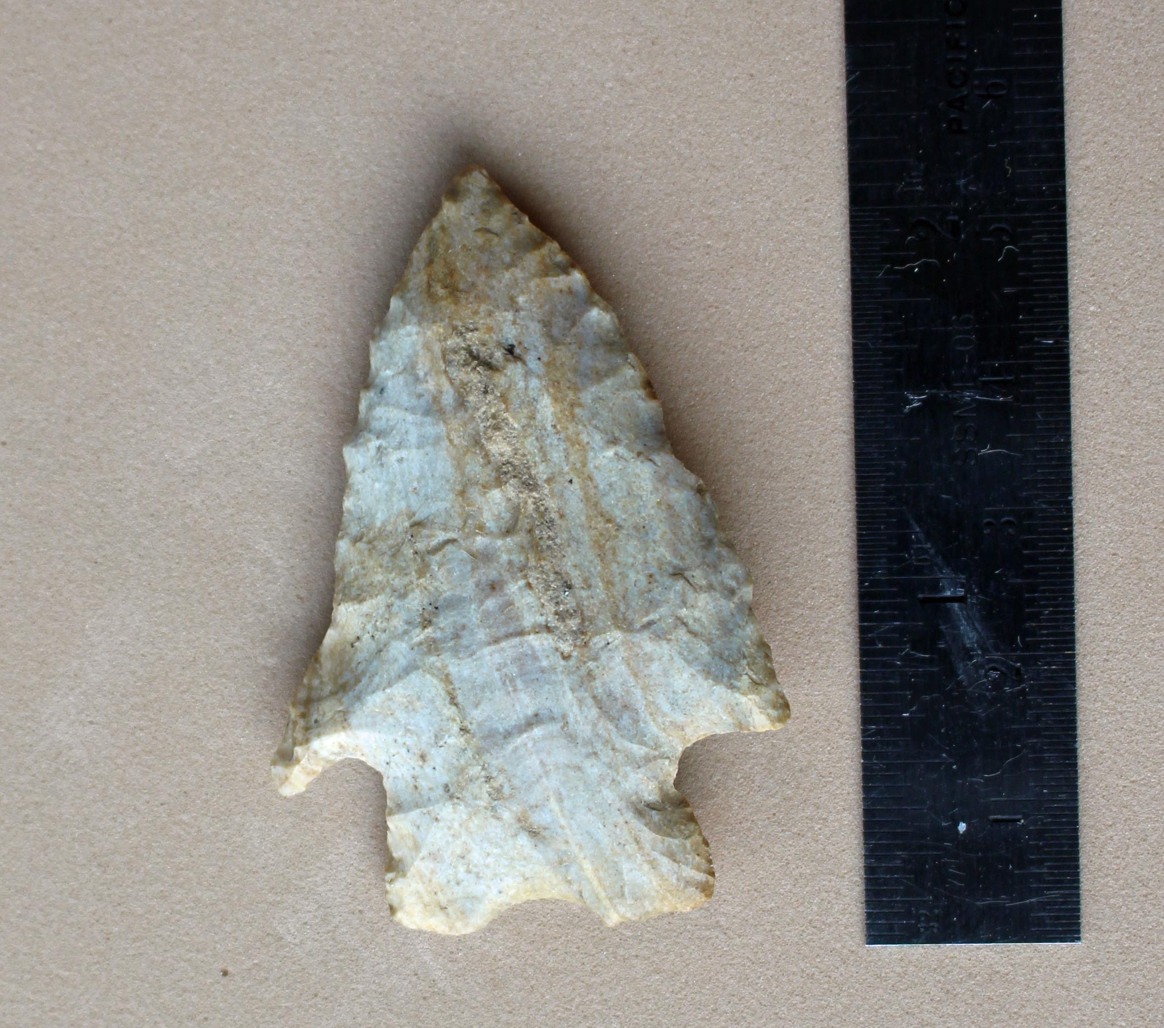 MacCorkle Bifurcate Point. 2" long a fine specimen of the type. This is made of some sweet looking banded chert. Came out of a Kentucky collection. 30 day Satisfaction Guarantee. $5.00 first class mail. If you are purchasing more than one artifact and using PayPal please contact me prior to paying for shipping discounts. If there is no contact or payment from buyer within 24 hours of clicking the PayPal button the item will be relisted.