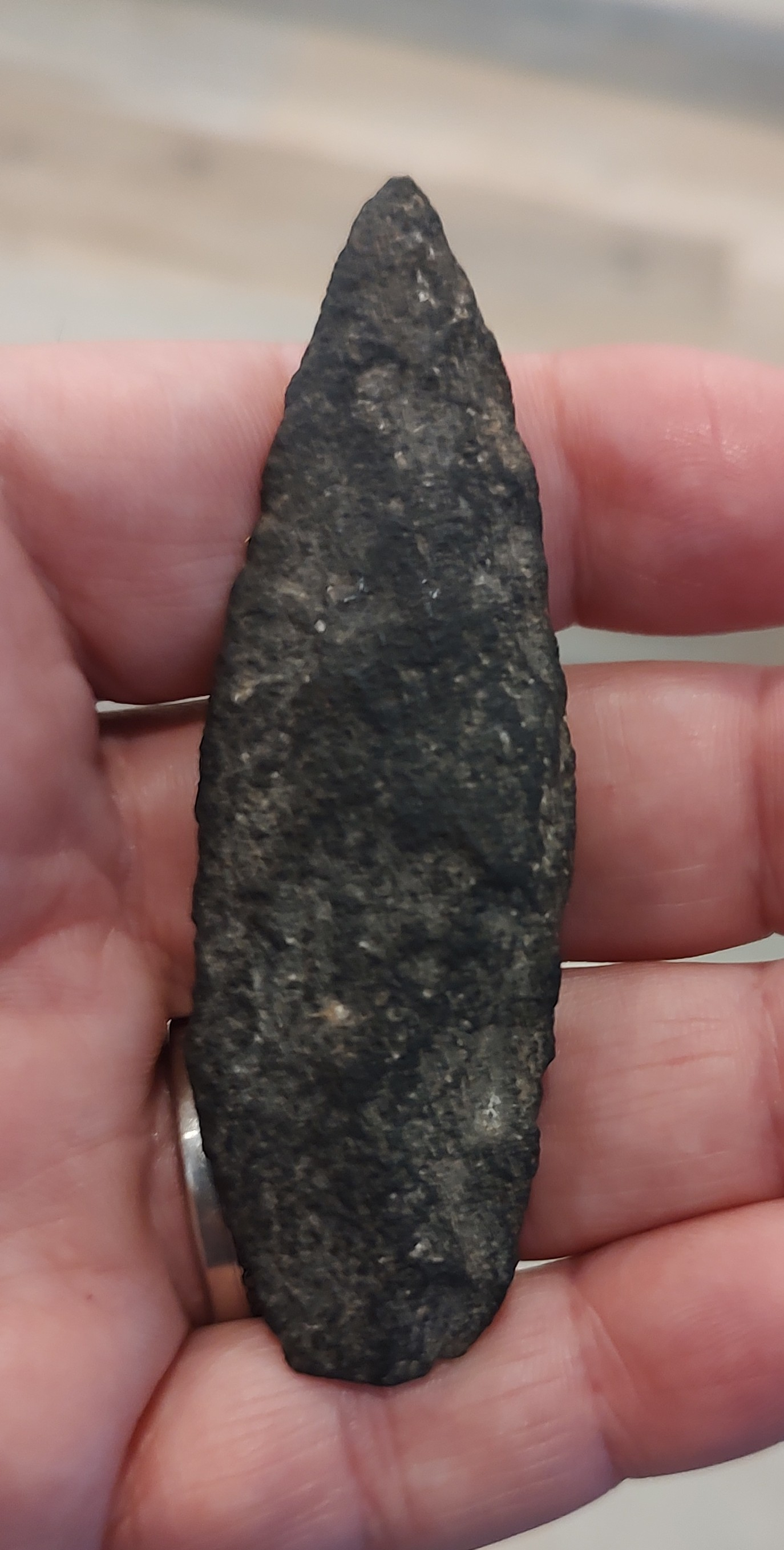 Greene point made of Rhyolite. These points resemble the Guilford long narrow contracting stem. However this is a later type. These are late woodland in age. 1,700 - 1,200 B.P. this one if made well and measures 3 and 5/16" long. 30 day Satisfaction Guarantee. $5.00 first class mail . If you are purchasing more than one artifact and using PayPal please contact me prior to paying for shipping discounts. If there is no contact or payment from buyer within 24 hours of clicking the PayPal button the item will be relisted.