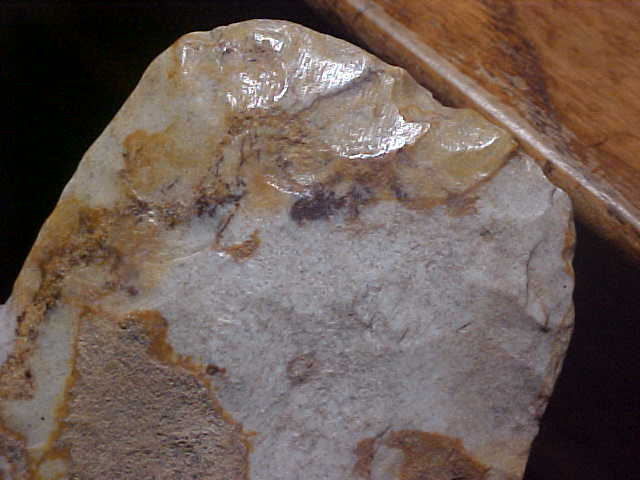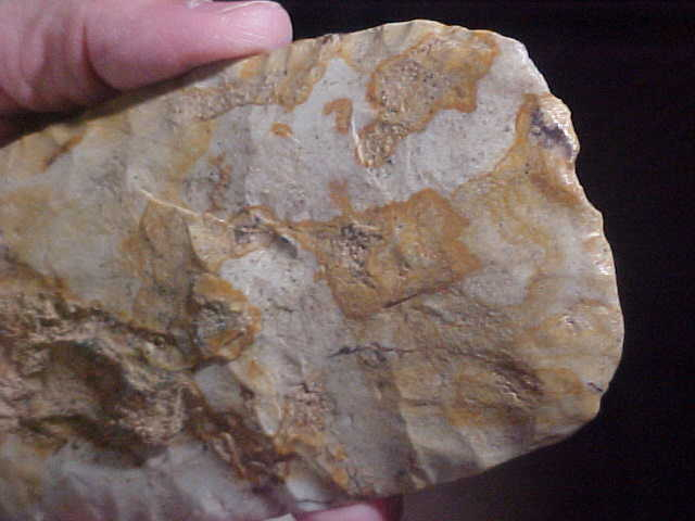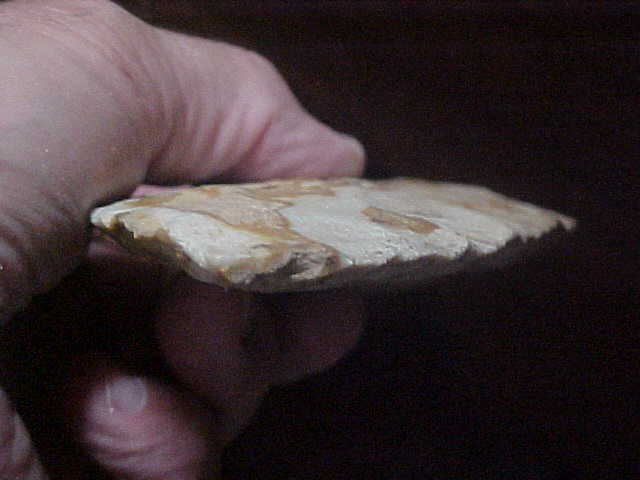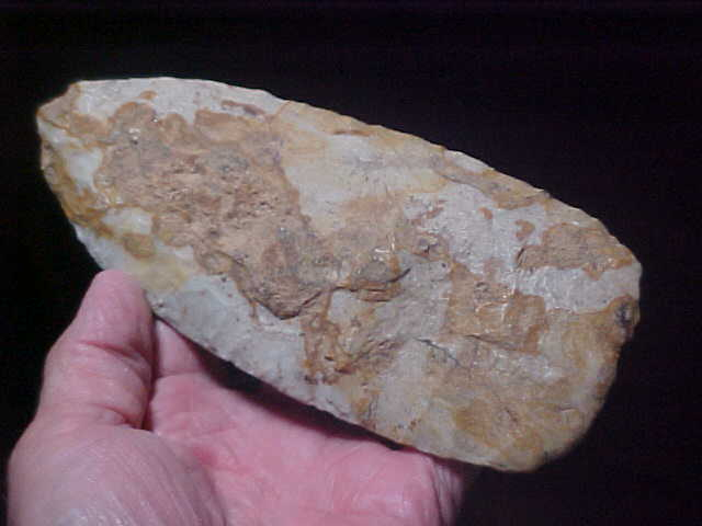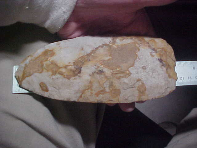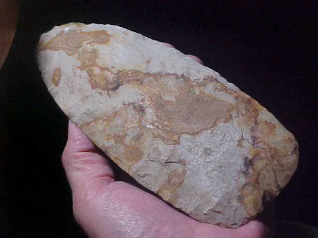 Numerous inclusions all over the surface of the normally whitish-grey Mill Creek Chert, it gives the flint a more Kaolin-like look--the flints may be more alike from a geologist's point of view that we collectors assume. Here, I'm guessing the iron content made the chert much harder--definitely made the Union--Jackson County, Illinois Mississippian spade more colorful. Length is 6&13/16" by 2&15/15", thickness never exceeds 13/16", and that's only on a small 'stack' in the center--most of the spade is in the 5/8" thickness range. The bit shows some absolutely great polish from all that corn chopping in sandy rivers-edge soils. There is slight polish on the handle-end, likely ground smooth either for preserving the lashings used or due to slight movement of the head over the period of service (years?). The finder walked a Mississippian village site for years, his collection had four broken spades (the bit ends, not the heels); each showed heavy use polish. A neat piece, lifetime guaranteed authentic in every detail. Shipping is $13.00, checks or M.O.s are welcomed, however I do not use paypal--Roy A.