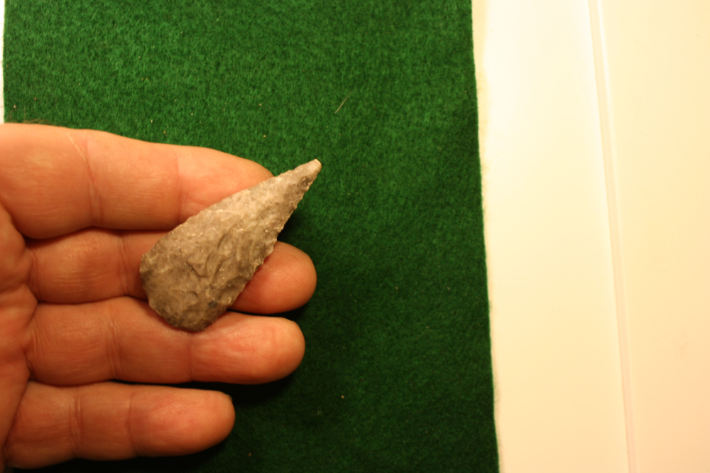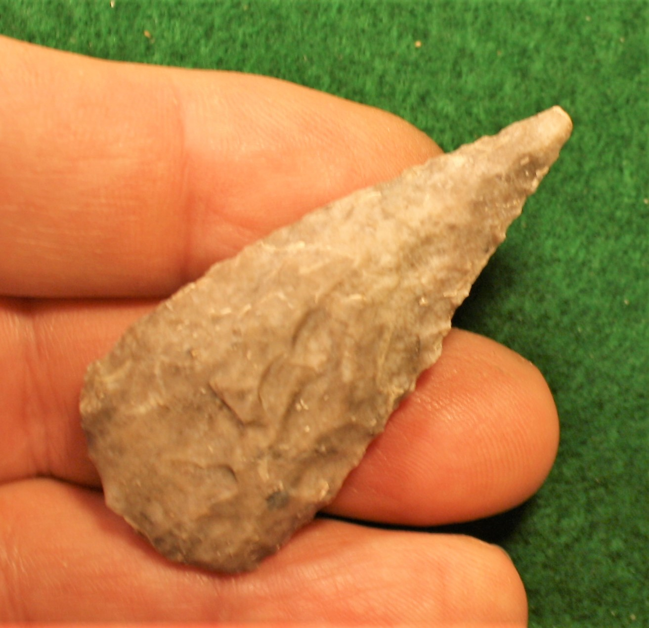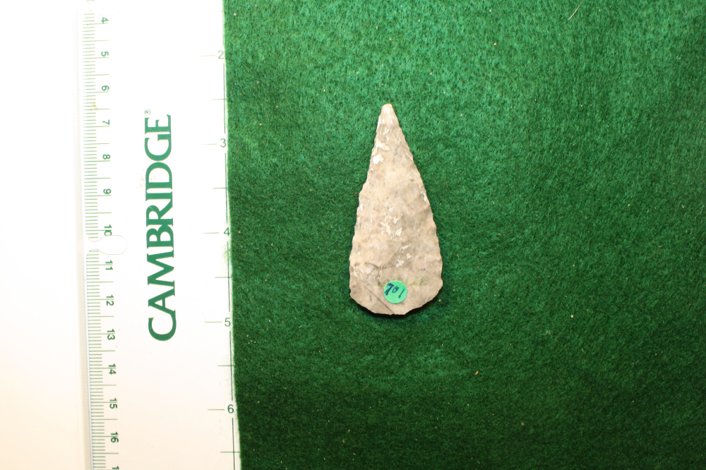 This artifact is made of an Edwards Gray Chert with patina as well as some encrustations from the soil.