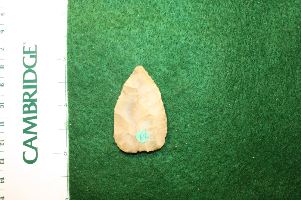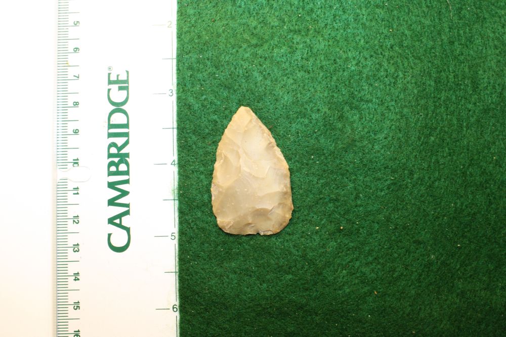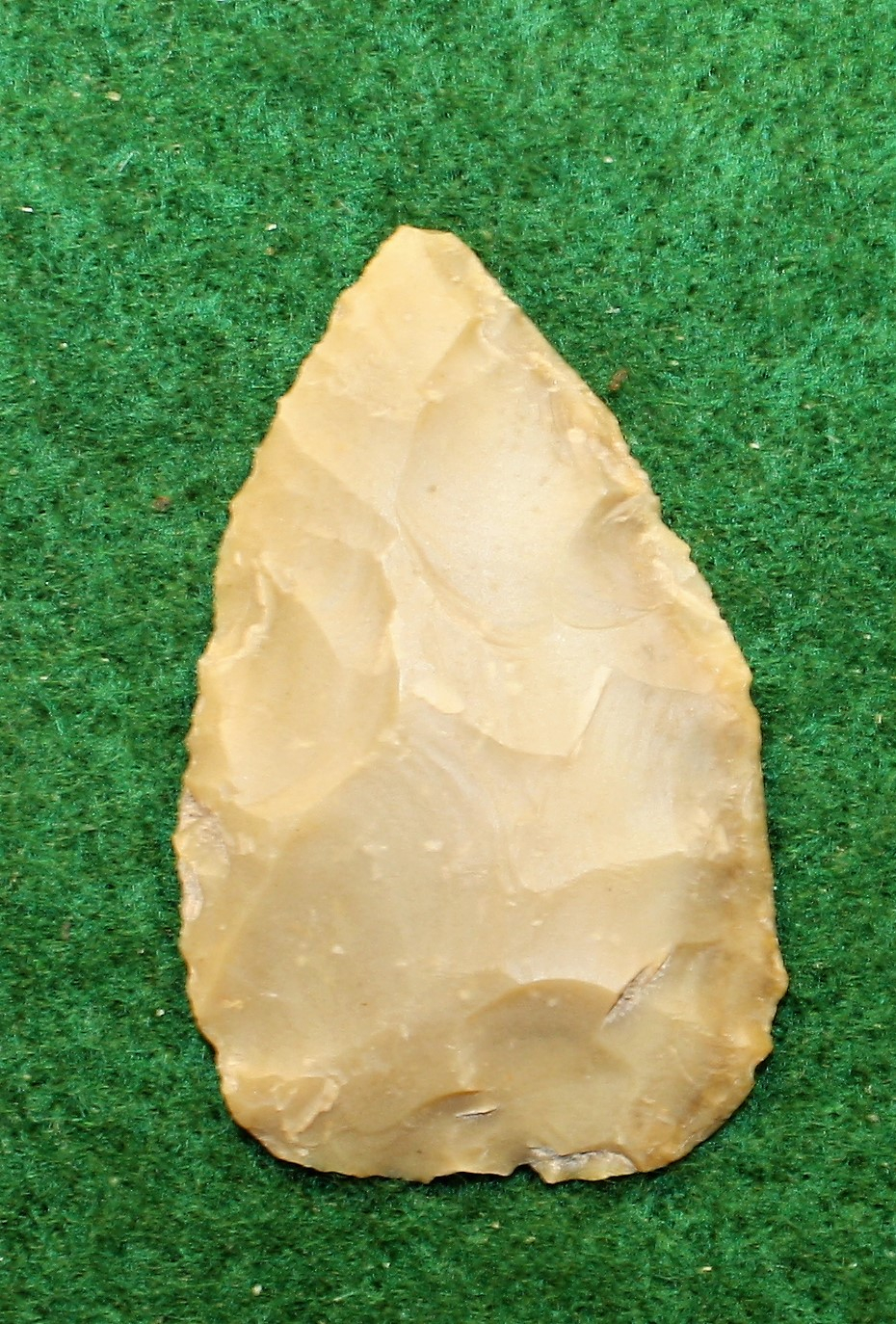 This artifact has an olive colored finish due to the patina on this Edwards Chert. It is thin for it's size with nice edgework.