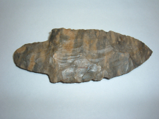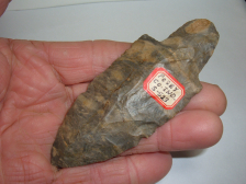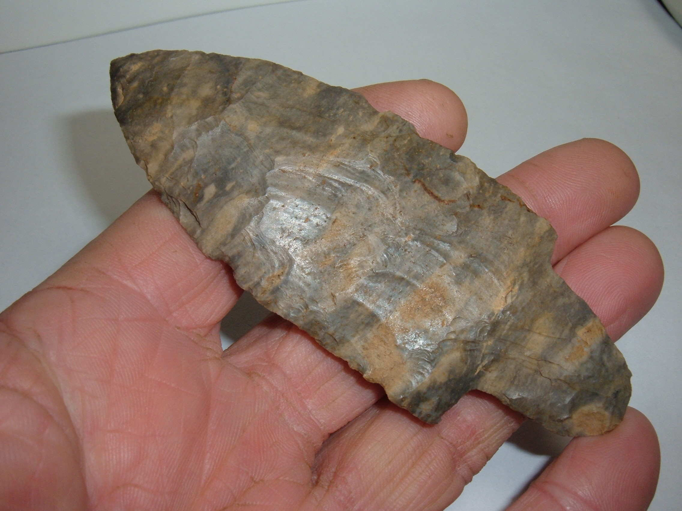 HERE WE OFFER THIS EXCEPTIONAL ADENA , 4 3/16" FOUND IN POSEY CO.INDIANA. MATERIAL IS BEAUTIFUL COLORED MOTTLED COSHOCTON FLINT! THIS FINE EXAMPLE IS EX ROBERT SCANLEN, A WONDERFUL EXAMPLE OF THE ADENA CULTURE!