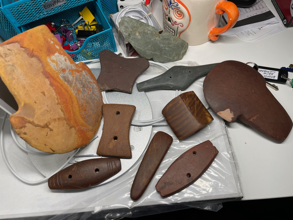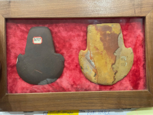A claystone Gorget from Walker county Georgia and a clayston Saddle Bannerstone both from the late John Grotte collection.