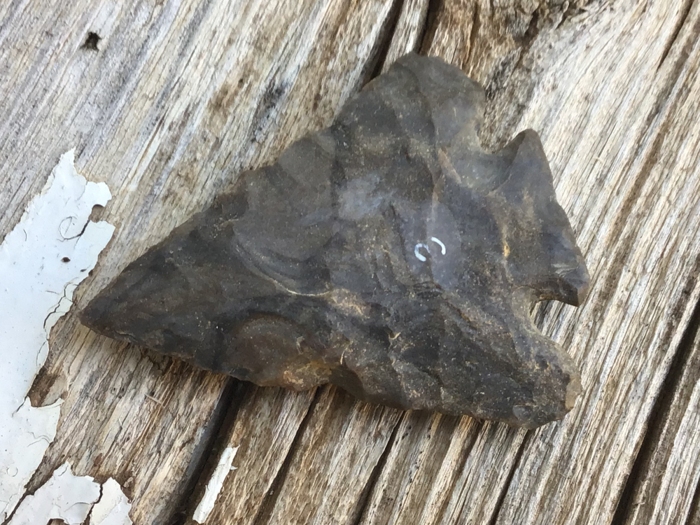 Made of Fort Payne Chert was recovered in Bourbon Co. KY. It is thin and well flaked but does have a small inclusion that broke off in the ancient past. It has heavy patina with a heavily ground base and all edges show use wear. I have the shipping and it comes with a Perino COA.
