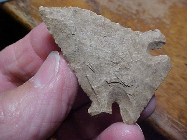 Out of a Hopkins County, Kentucky based collection--wasn't labeled if it was found there in Hopkins County, or across the Pond River in Muhlenburg County. The piece has excellent Early Archaic chipping--pure Pinetree, but what keeps the price reasonable is that the material is either a "tan chert" or a cortex off a Hornstone slab--I wish the flint were better, but the craftsmanship the Pinetree knapper put into the point, that's impressive: needle tip, basal grinding ( heavy), blade edge serration, and a "hooked barb" that I think was original to the blade--measures slightly over 1&7/8" by 1&1/2", 5/16" max thickness in the center. Every detail is lifetime guaranteed authentic. Shipping is $8.00, and payment welcomed by check or M.O.--sorry, I do not use paypal--Roy A.