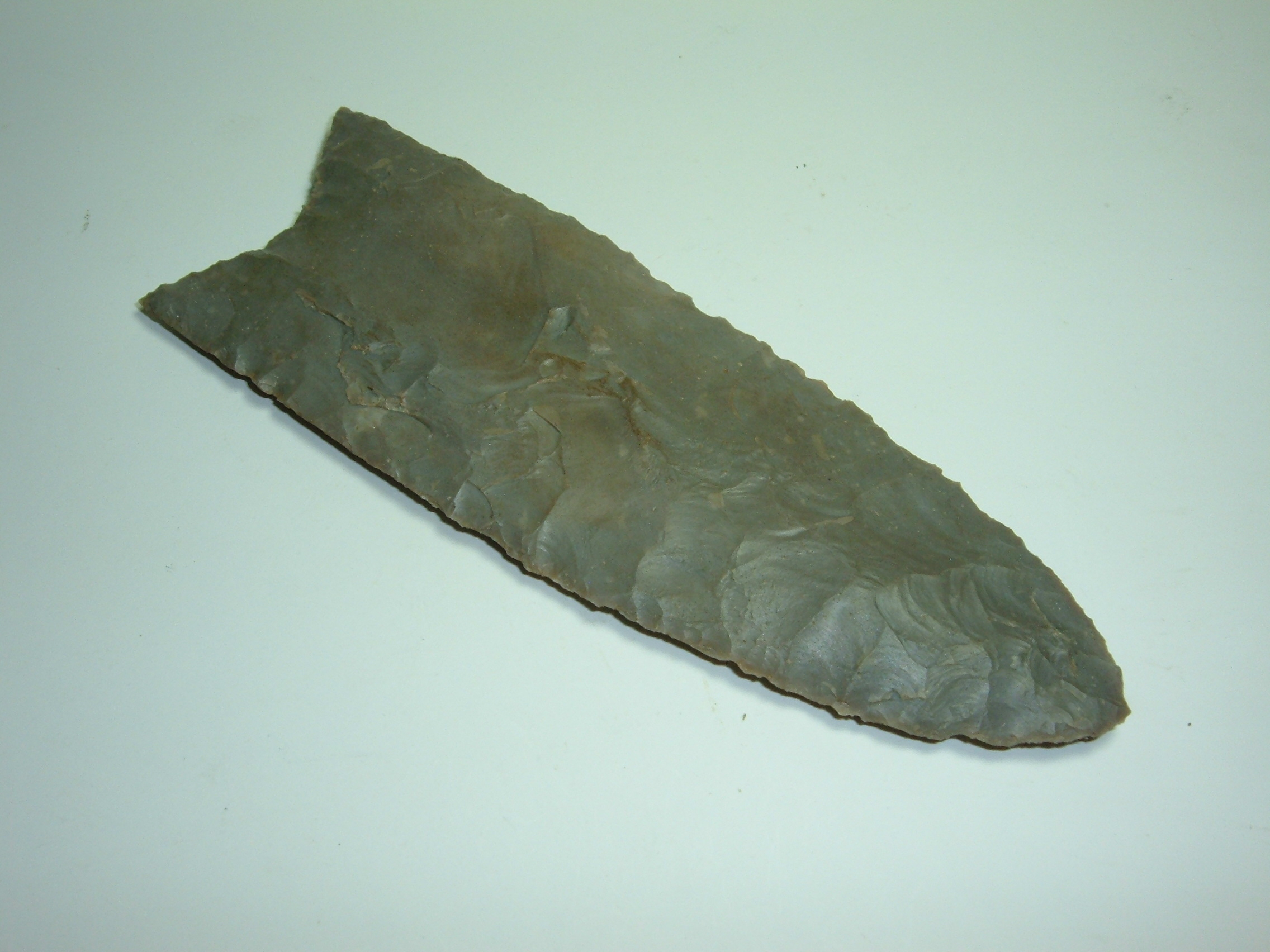 FROM OUR PERSONAL COLLECTIONS COMES THIS ULTRA MONSTER FLUTED CLOVIS, GIANT AT 5"!!! THESE GIANT FLUTED POINTS ARE GETTING HARDER AND HARDER TO OBTAIN AND SELL AT AUCTION FOR MEGA$$$! THIS INCREDIBLE EXAMPLE WAS FOUND IN THE 1930'S BY JESSIE WALKER ON THE HUPP FARM NEAR BROWNSVILLE,LICKING CO.OHIO! RESEMBLES HORNSTONE BUT IS ACTUALLY HEAVILY PATINATED FLINT RIDGE FLINT. HERE'S YOUR CHANCE,FOR THE NEXT FEW DAYS TO ADD A GIANT CLOVIS TO YOUR COLLECTIONS!