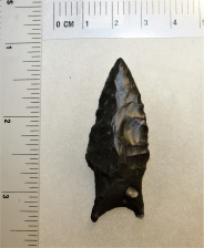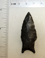 It is a glossy black Owl Creek Chert and it is sharp and pointy.
