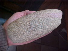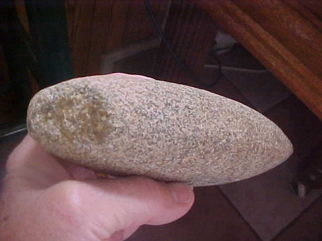 The number of Celts that get over seven inches (7&1/4" by 2&15/16", 1&15/16" thick), they're few. When they're absolutely guaranteed authentic for life the number goes down some more--a great Celt out of Fayette County, Illinois, ex Richard Brewer Collection--the front edge has his catalog number inked-on. Made of a very good grade of granite, highly polished and formed. A note on the 'form'--what looks like a heel (poll end) break is actually a place where the Woodland/ Mississippian Era maker made the piece so long he rad to the very edge of the granite cobble used--there wasn't enough granite to fully make a rounded end; it's NOT a break, and it's ground smooth. Is the piece perfect--no--there are some light farming-made marks, and the bit shows obvious signs of usage--you can even find a spot on the bit where there was a 'touch up" of a bit chip. Again, every detail is authentic, period. Shipping is included with the price and checks or M.O.s are the ways I welcome payment. Sorry, I do not use paypal--Roy A.