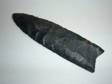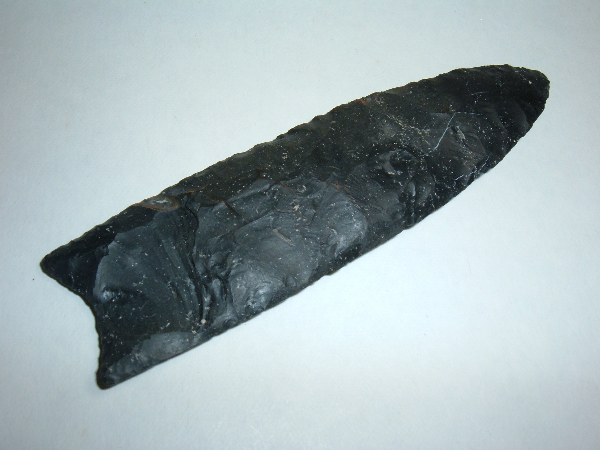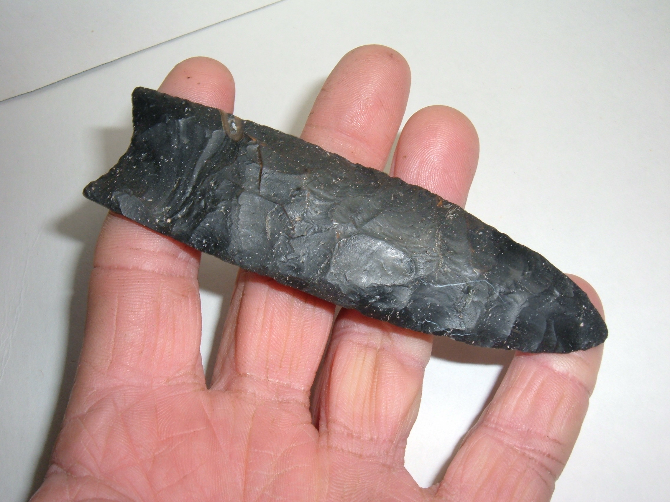 THIS IS UNDOUBTEDLY ONE OF THE FINEST LARGE COSHOCTON CLOVIS WE HAVE EVER LISTED!FOUND IN STARK CO.OHIO IT MEASURES A WHOPPING 4 3/8"AND HAS WONDERFUL FLUTING ON BOTH SIDES! THIS REMARKABLE CLOVIS IS EX GILBERT DILLEY, A VERY WELL KNOWN OLD TIME OHIO COLLECTOR WHO LIVED UP ON FLINT RIDGE IN LICKING CO.OHIO. THIS POINT IS BEAUTIFUL BLACK COSHOCTON FLINT WITH TWO SMALL QUARTZ "LIGHTNING BOLTS " TOWARD THE TIP! IF YOU HAVE BEEN WAITING FOR AN INCREDIBLE CLOVIS THIS MAY BE IT !