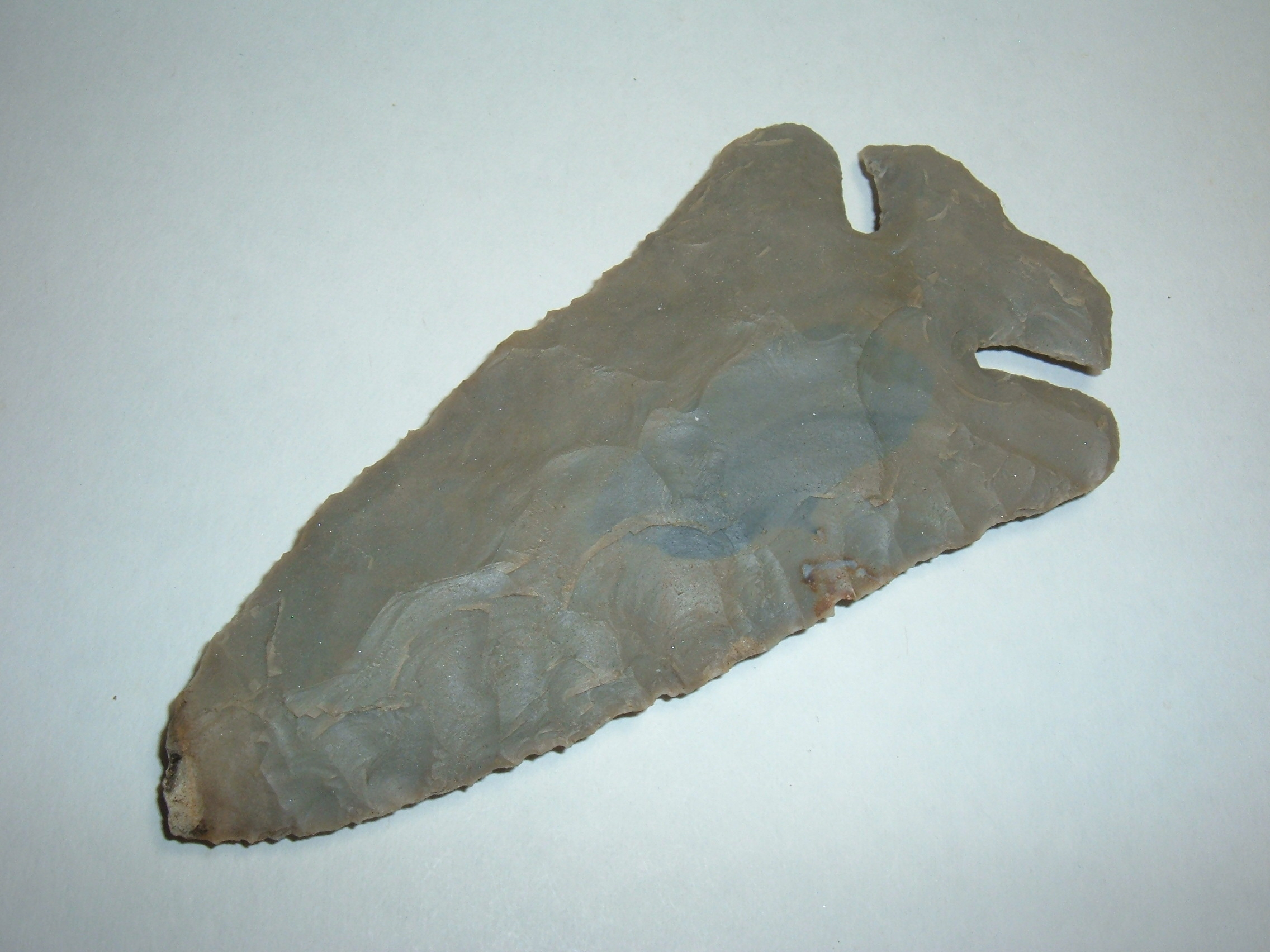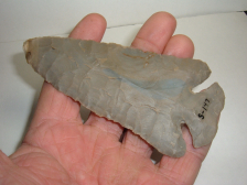 HERE WE OFFER AN INCREDIBLE GIANTTHBES/NOTCH BASE DOVETAIL AND I TYPE IT AS SUCH FOR THE FACT THAT IT INCORPORATES CHARACTERISTICS OF BOTH THESE POINT TYPES! I WOULD TRULY CALL ITY AN INTERGRADE POINT BUT WHATEVER YOU TYPE IT I THINK YOU WILL AGREE THAT THIS MONSTER IS REMARKABLE! FOUND IN HURON CO.OHIO IT MEASURES JUST A TOUCH UNDER 5" COMING IN AT 4 7/8"!!! THIS POINT IS EX JEFF SARNOWSKY AND DISPLAYS HIS CATALOG # NEAR THE BASE. MATERIAL IS BEAUTIFUL INDIANA HORNSTONE !