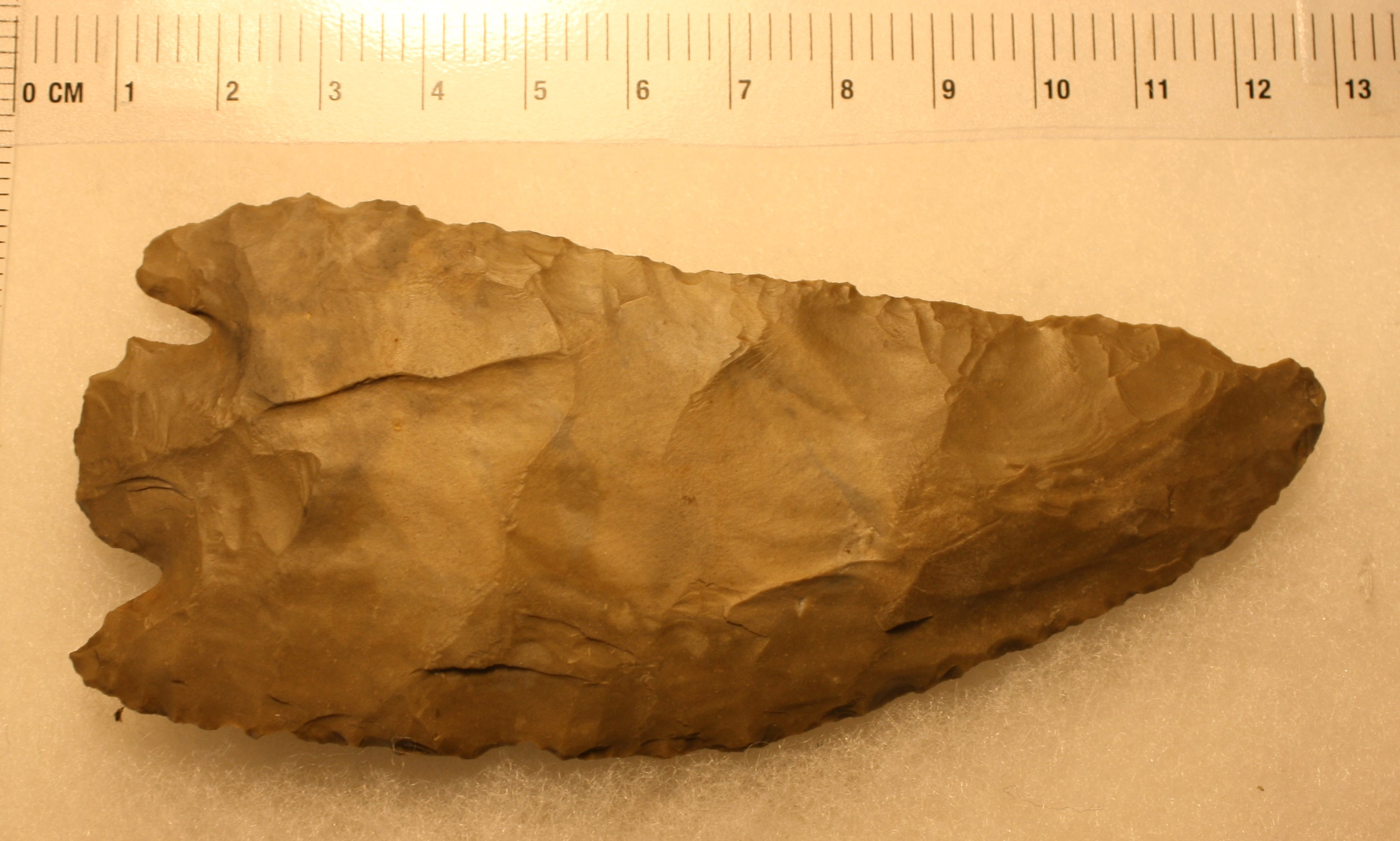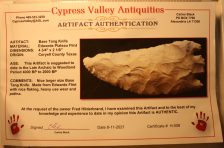 This is a larger size Base Tang Knife that is over 4 1/2 inches long and about 2 1/2 inches wide. It has nice flaking and heavy use wear and patina.