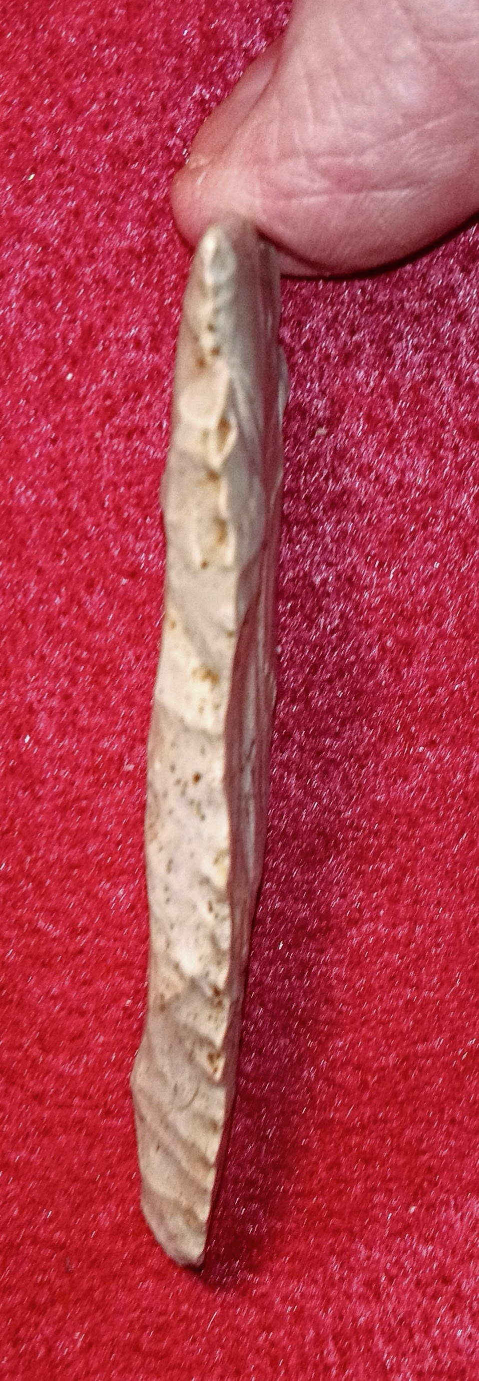 A stunning gray, Lost Lake knife made of Hornstone with beveled edges and a splendid bullseye pattern showing on each side. This artifact was found in White Co., Illinois and comes with a Dwain Rogers COA.