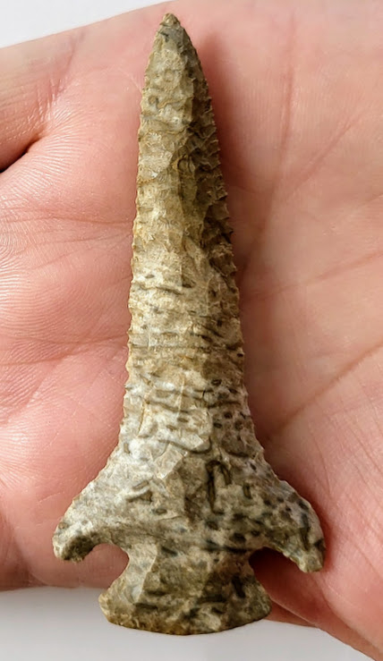 This very symmetrical Kirk Corner Notch Drill is made of white and gray mottled chert and was probably a knife that was later re-sharpened into a drill form. The drill was found in Franklin County, Ohio and comes with a COA from Carlos Black. Some people have suggested this is a Pine Tree Point but it was papered as a Kirk Corner Notch by Carlos Black.
