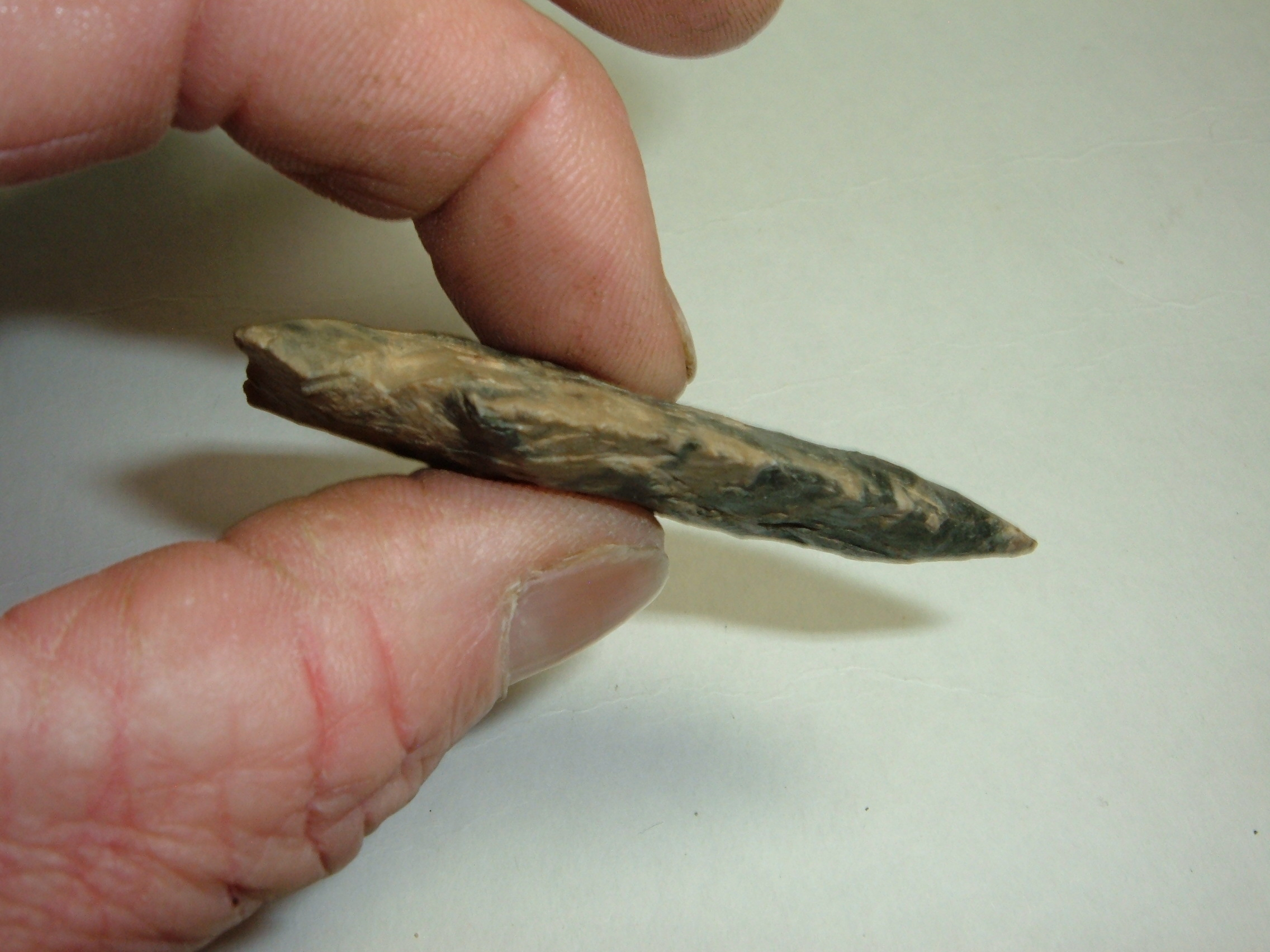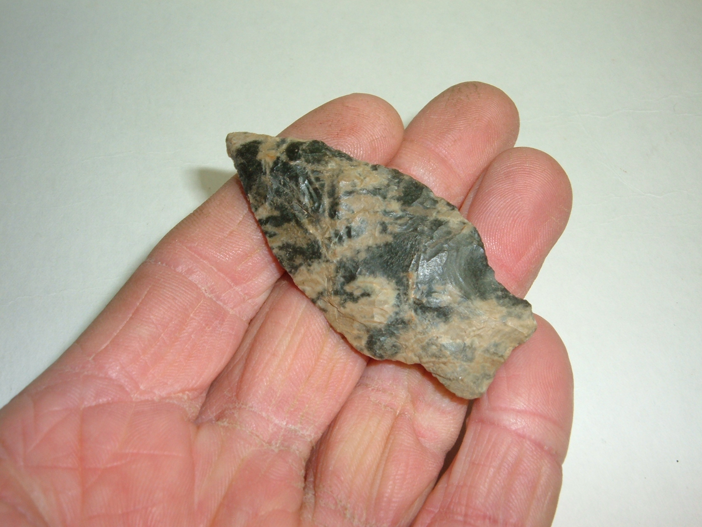 HERE WE HAVE A VERY NICE ARCHAIC STEMMED POINT, 2 1/2" AND FOUND IN CLARK CO.OHIO! EX BILLY RESNICKE AND CAME OUT OF A CONVERSE AUCTION. MATERIAL IS BERAUTIFUL MOTTLED COSHOCTON FLINT , A VERY NICEEXAMPLE!!