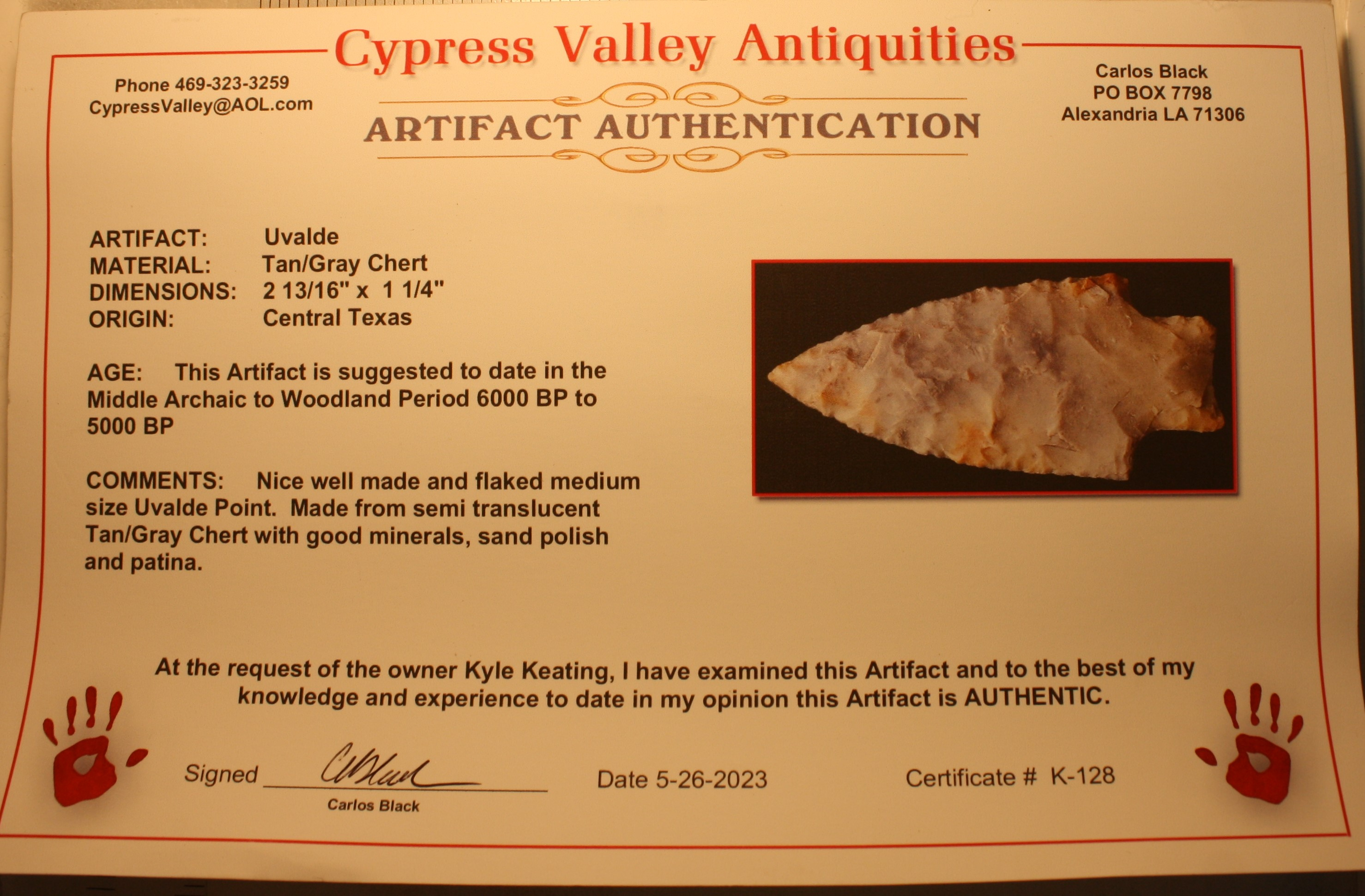 This artifact comes with a Carlos Black COA.