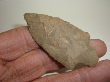 HERE WE HAVE A VERY FINE BI-POINTED KNIKE, FOUND IN AUGLAIZE CO.OHIO AND IS 2 3/4". THIS FINE EXAMPLE WAS FOUNDIN THE 1980'S AND IS EX TOM BRAUN! MATERIAL IS BEAUTIFUL DELAWARE CHERT, A SUPER EXAMPLE!