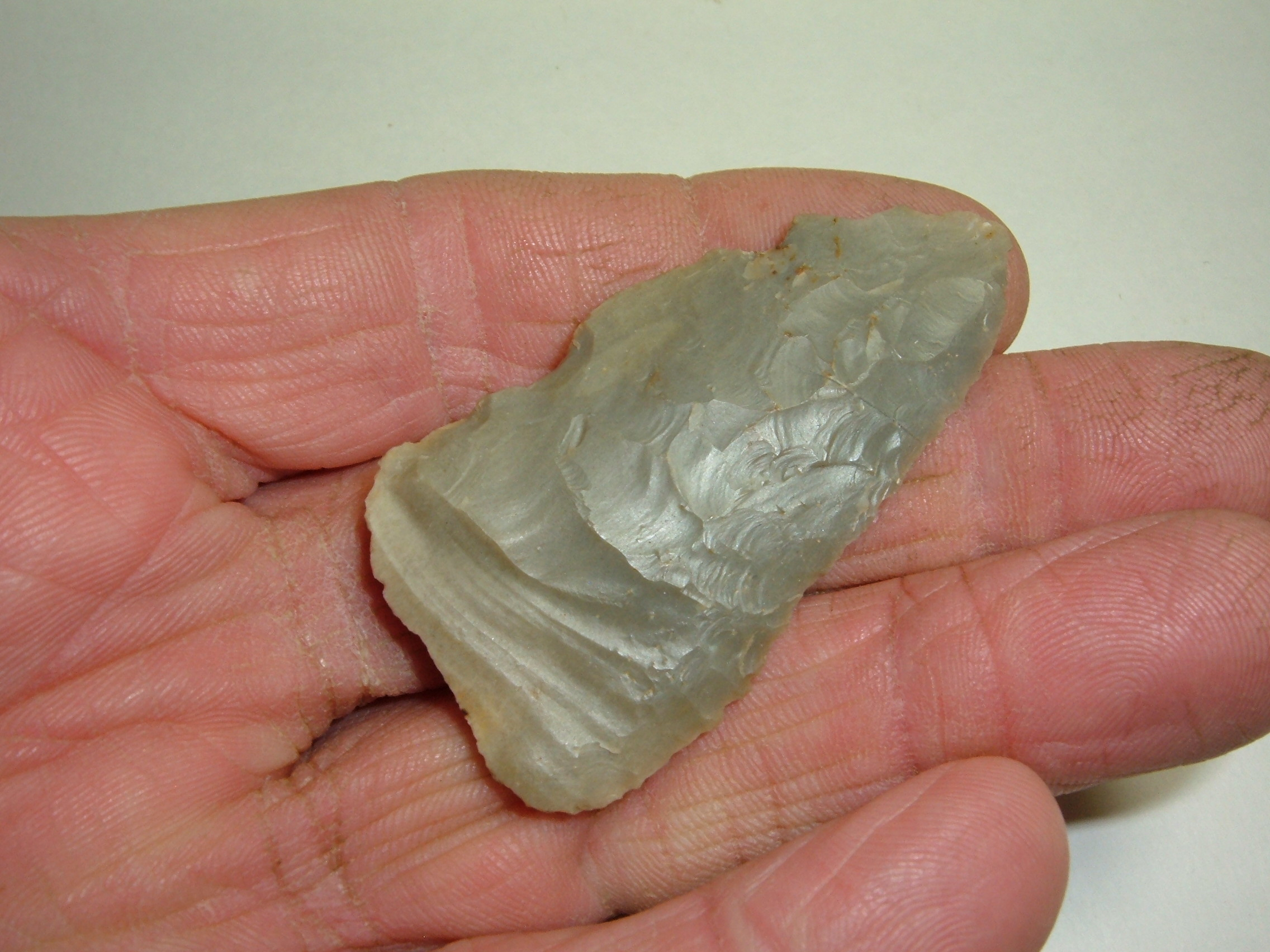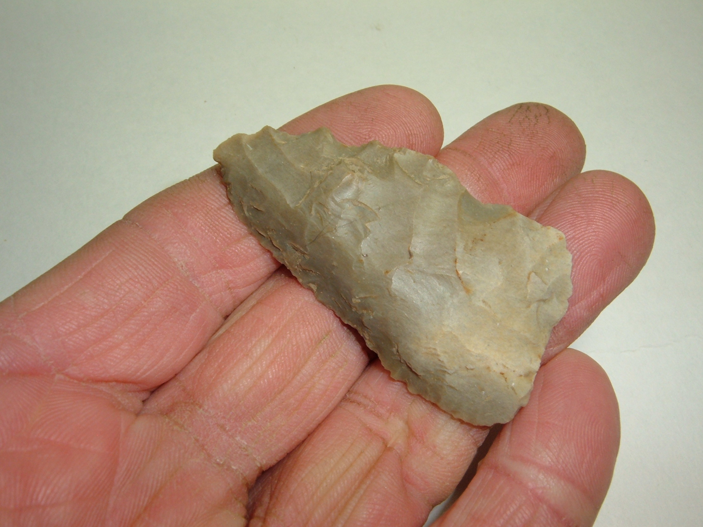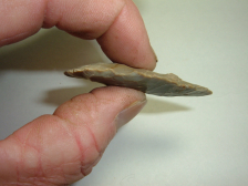 OFFERED HERE IS A NICE EXAMPLE OF AN ARCHAIC KNIFE, FOUND ON STEVE REBER'S FARM LOCATED ON THE LIKING/FRANKLIN OHIO CO.BORDER!THIS KNIFE MEASURES 2 1/2" AND IS MADE FROM INDIANA HORNSTONE. THIS KNIFE WAS WELL USED AND DISPLAYS NICE FLAKING TO IT!
