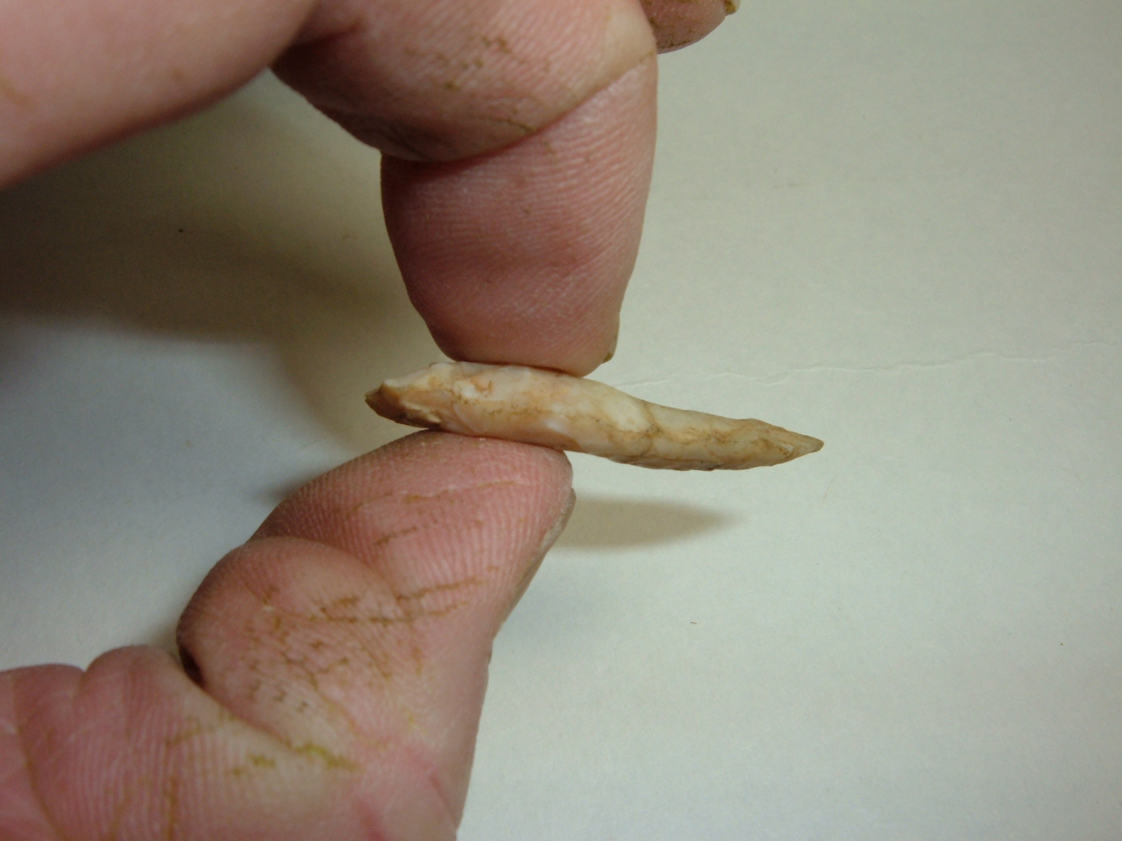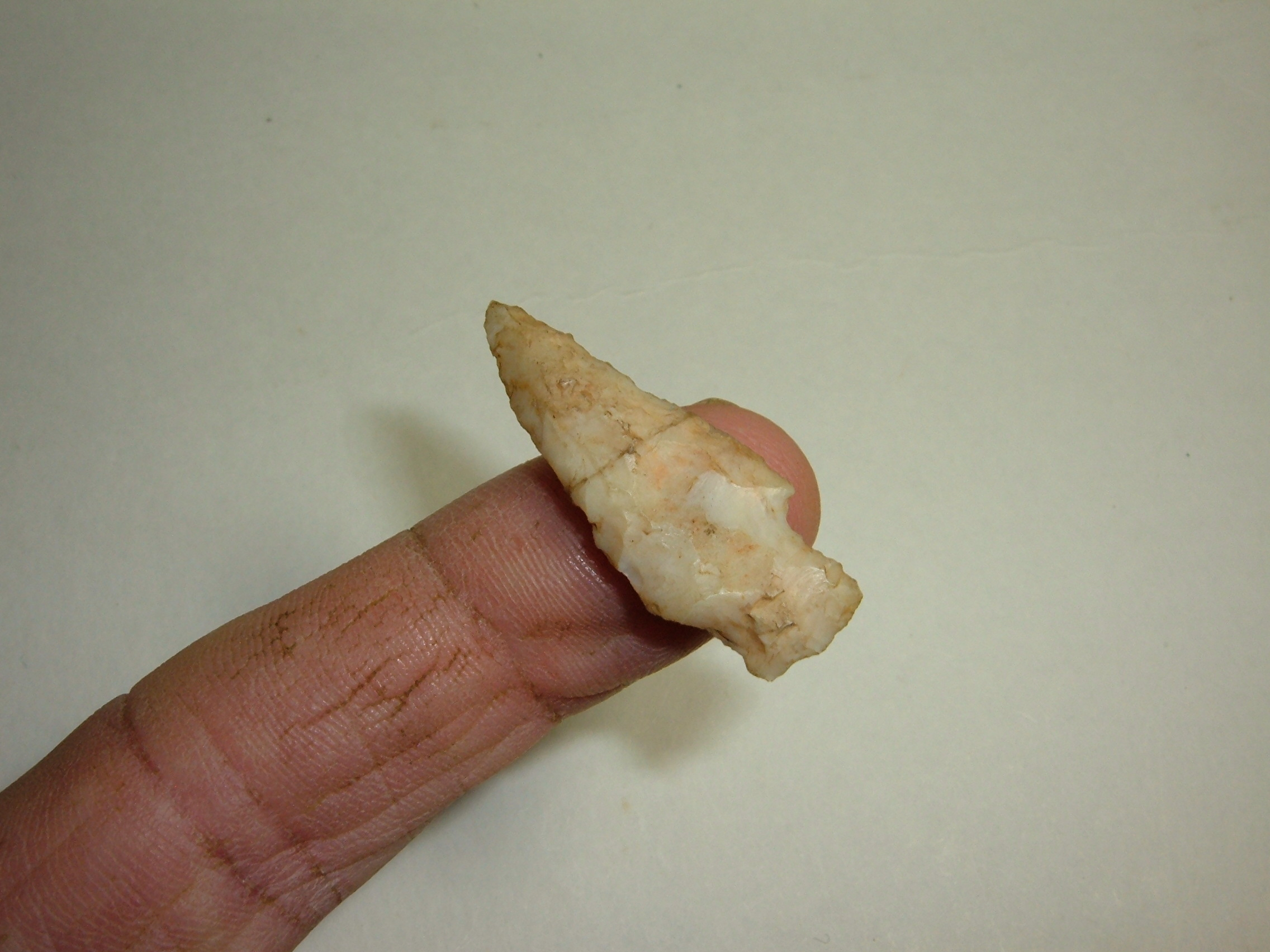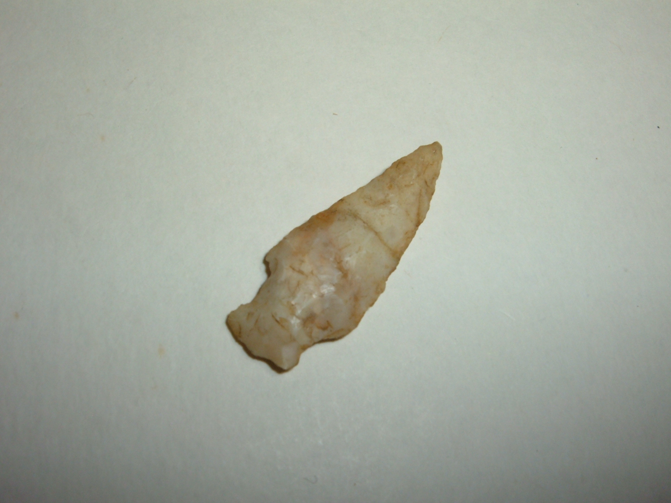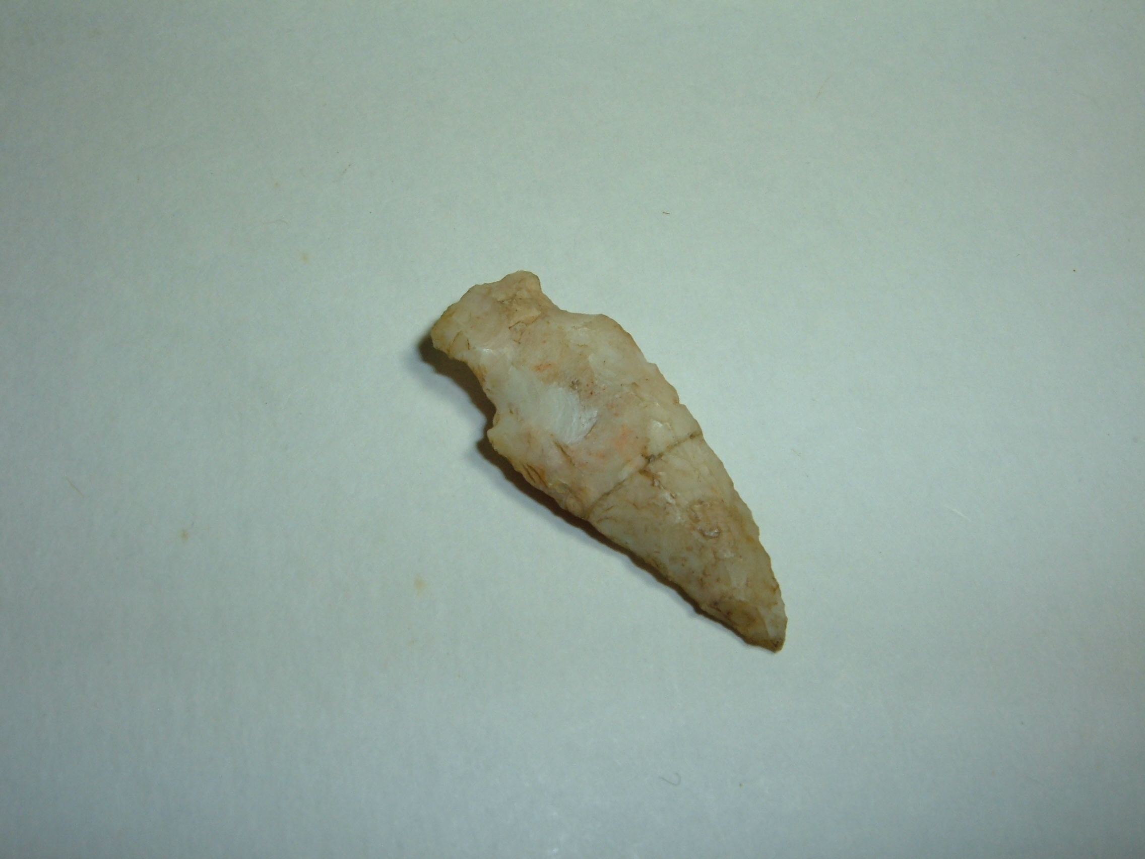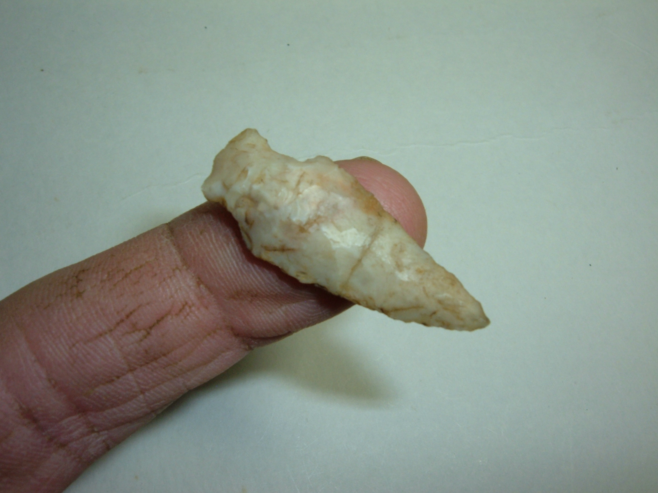 OFFERED HERE IA A VERY FINE ARCHAIC BIRD POINT, FOUND JUST SOUTH OF BUCKEYE LAKE ON THE BORDER OF PERRY/FAIRFIELD CO.OHIO AND IS 1 5/8"! MATERIAL IS BEAUTIFUL HIGHLY COLLECTABLE FLINT RIDGE FLINT,BEAUTIFUL LITTLE STEMMED POINT!