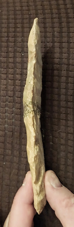 This gigantic Holt Tri-Notch knife is one of the rarest artifacts in the New World. This particular example was found in St. Louis Co., Missouri and comes with a Jim Bennett COA. The Holt Tri-Notch is so scarce that it isn't even listed in Overstreet or on internet artifact identification sites. In fact, mention of this type artifact can only be found in a few archaeology publications. If owning something that no one else has in their collection is your forte, this Holt Tri-Notch is for you!