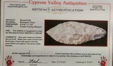 This Morse Knife is made out of a translucent Burlington chert and was found in Cooper County, Missouri. It comes with a Carlos Black COA.