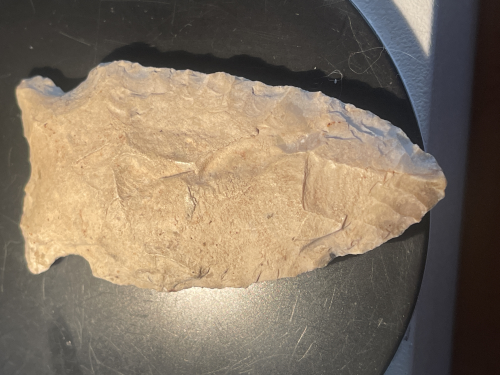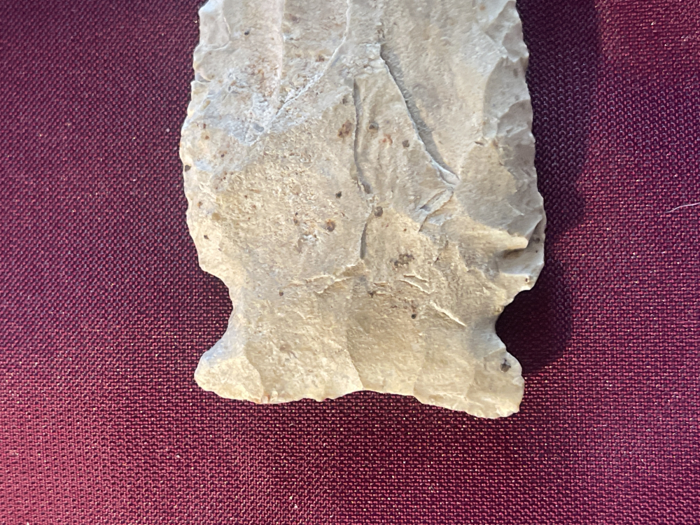 Classic Greenbrier morphology lacking fine edge work but some edge work can be seen, base is not completely ground but thinned.