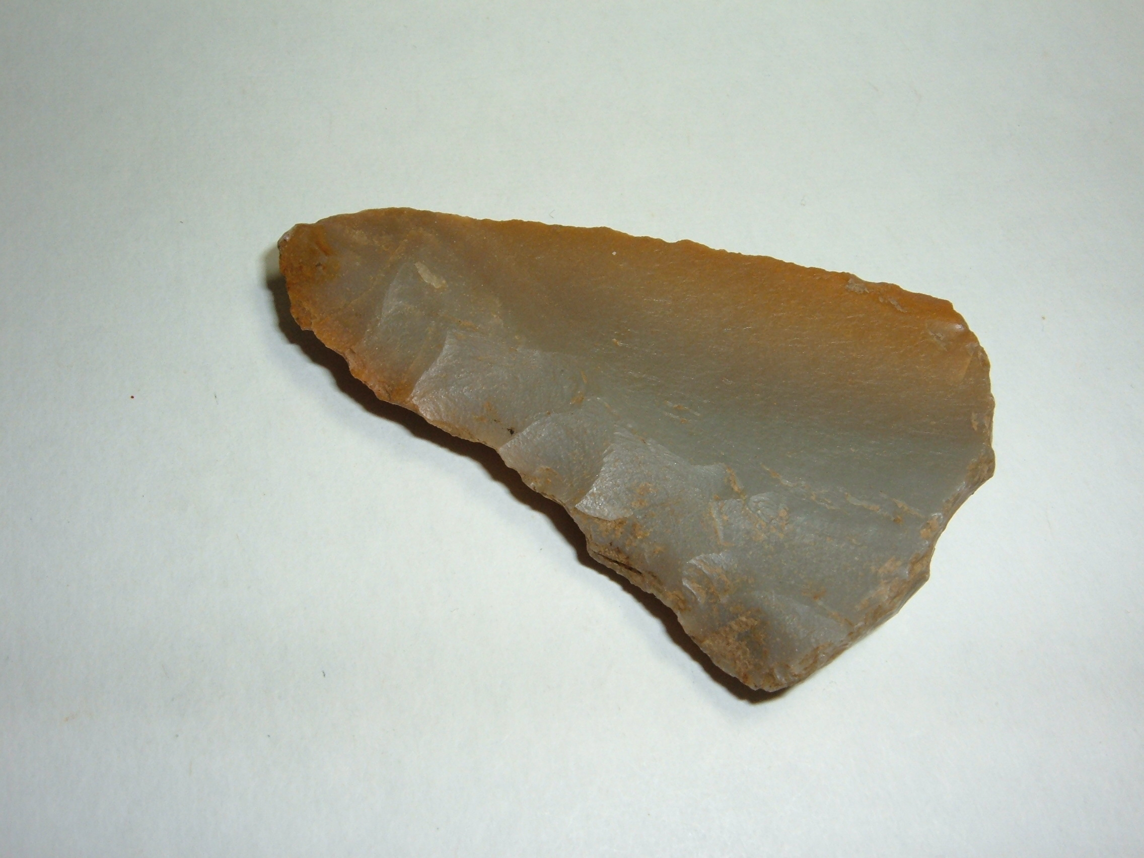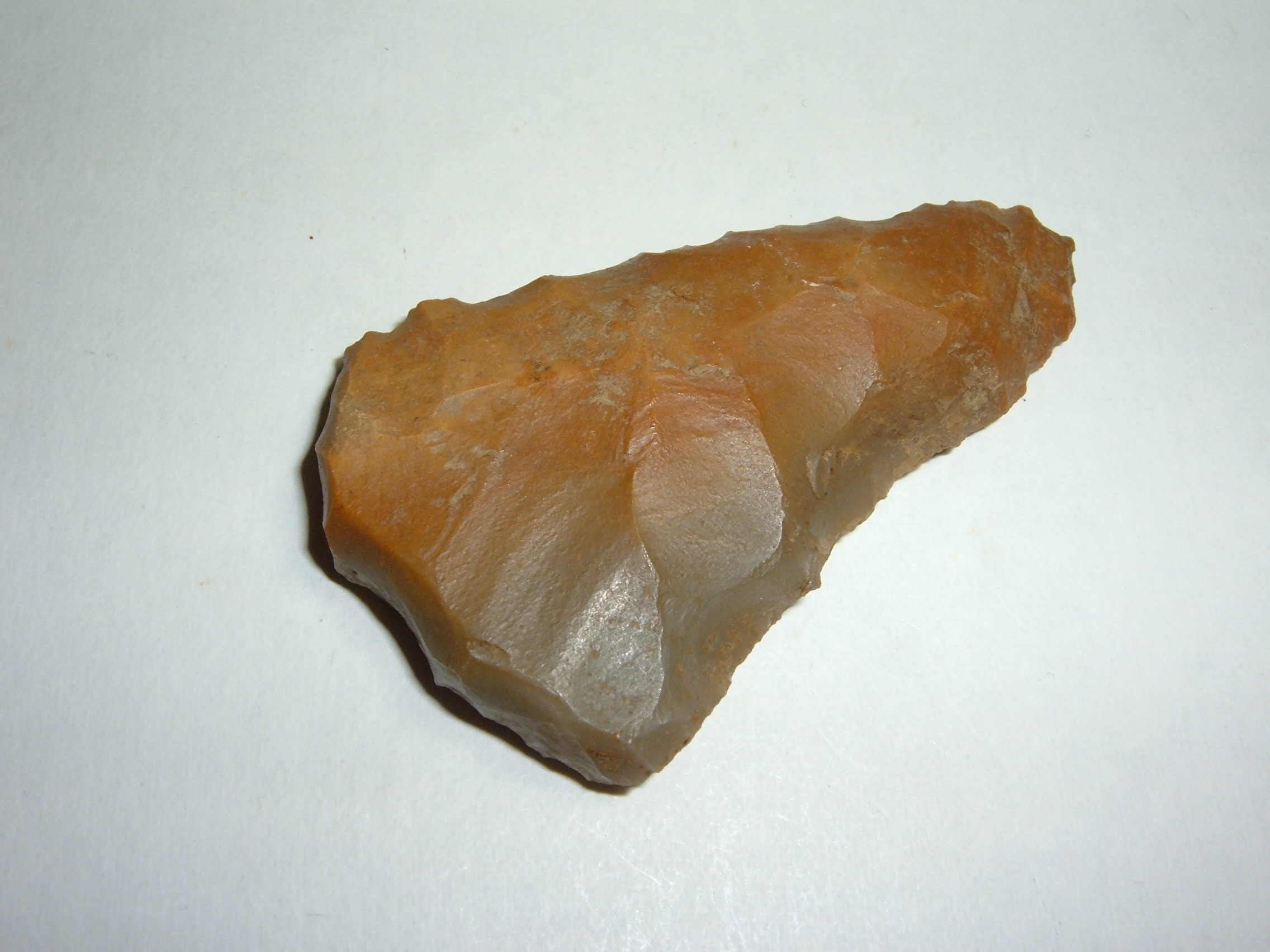 HERE WE HAVE A SUPERB PALEO UNIFACE KNIFE ,FOUND IN OWEN CO.KENTUCKY AND IS 2 1/2". MATERIAL IS GEORGEOUS CARTER CAVE FLINT WITH ORANGE TANS AND GREENS PREDOMINATING, A MOST EXCELLENT RELIC!