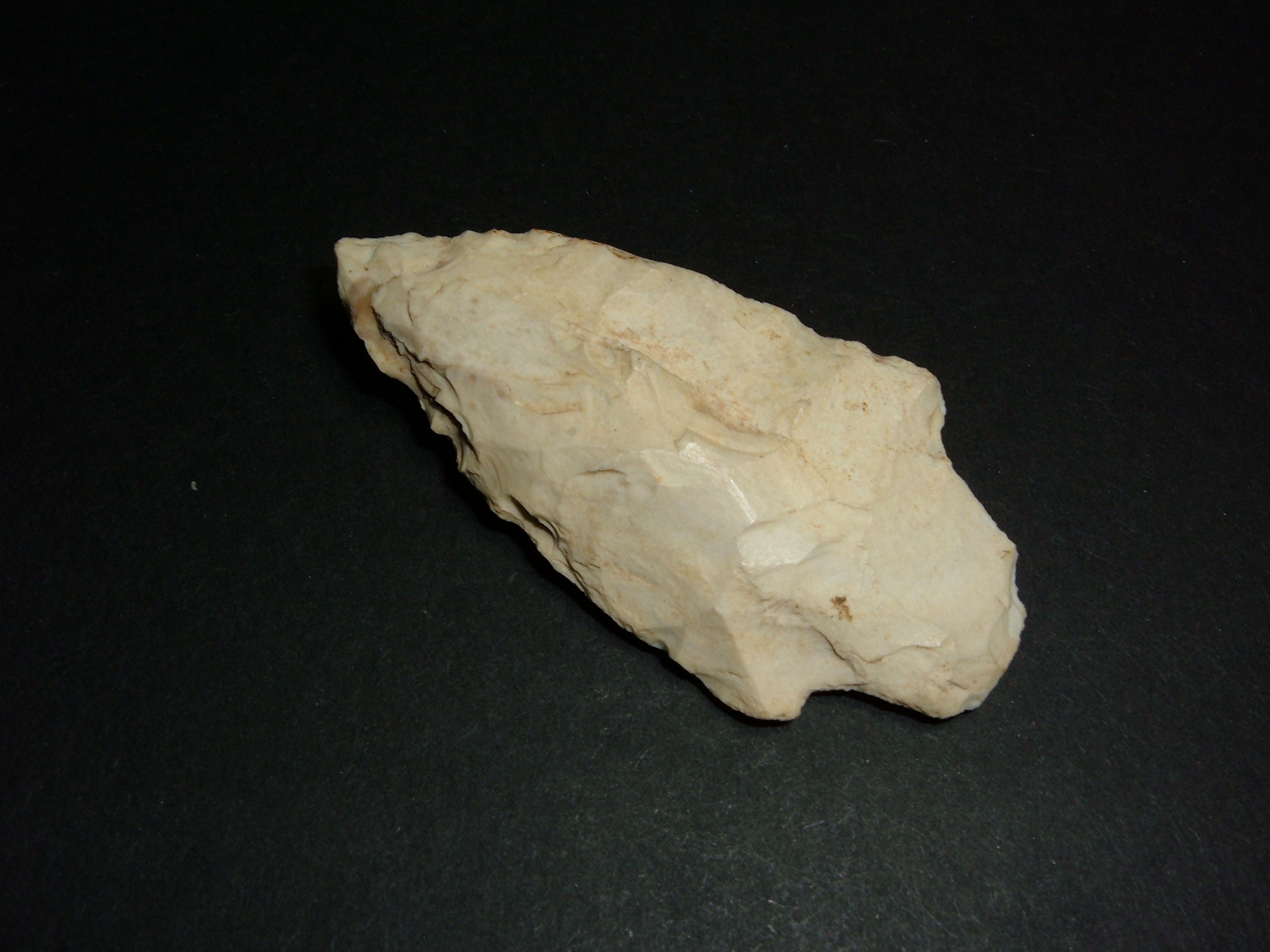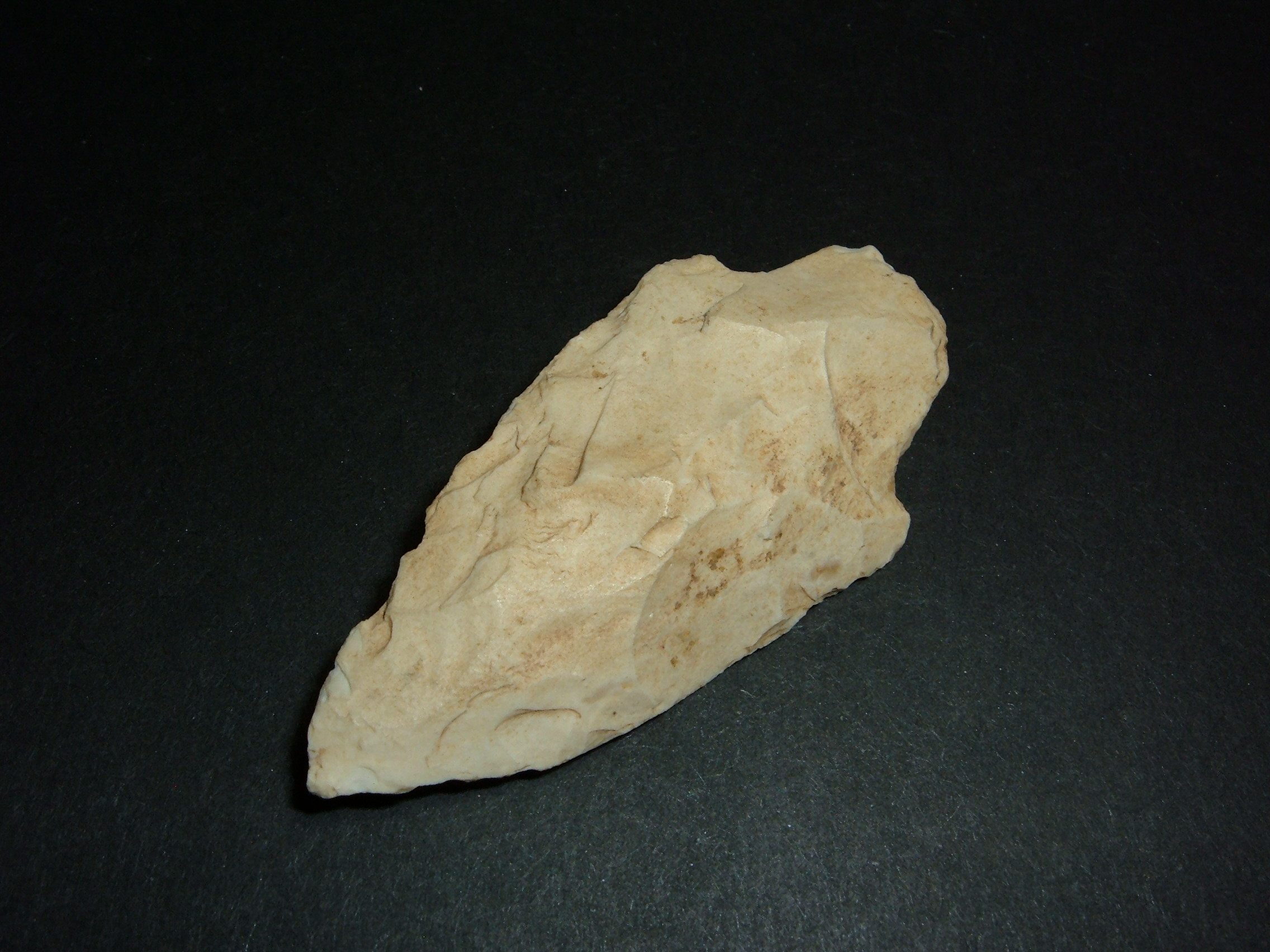 THIS NICE EALY ADENA POINT WAS FOUND IN LICKING CO.OHIO AND MEASURES 2 1/2". MADE FROM CREAM COLOR FLINT RIDGE FLINT IT IS HEAVY IN THE CROSS SECTION AND A VERY NICE EXAMPLE OF THE ADENA CULTURE IN OHIO!
