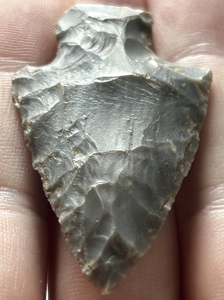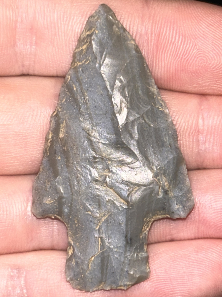 A super nice Buck Creek found in southern Indiana. Made from glossy light blue-grey striped Hornstone. In good condition and very well made.